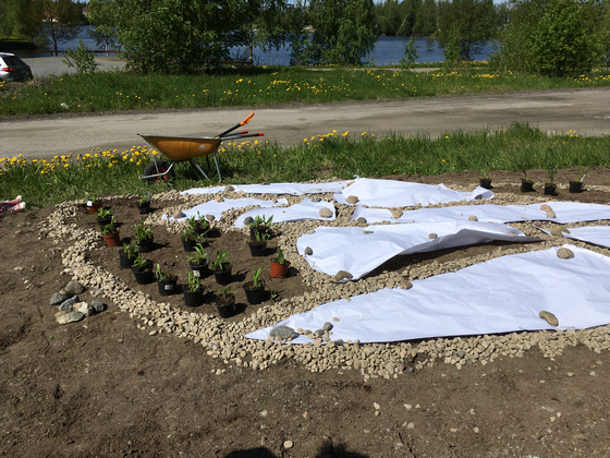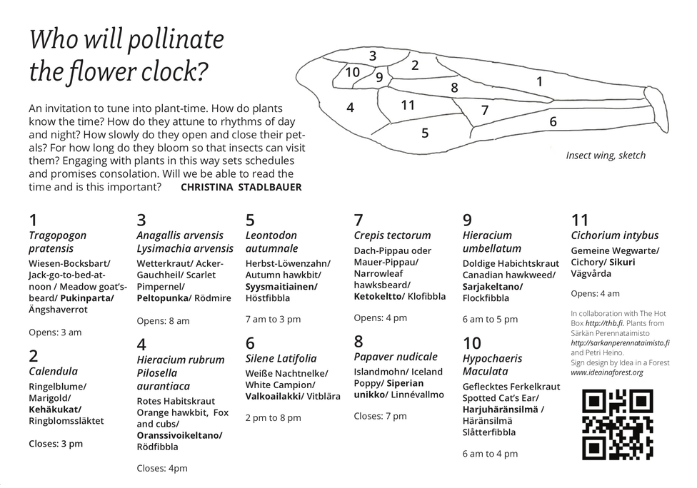The installation “Who will pollinate the flower clock” was installed first at Mänttä Art Festival in 2021. It featured a selection of flowers endemic to Finland, who follow a circadian rhythm. They were planted to attract pollinators including wild bees, butterflies, beetles and other insects.