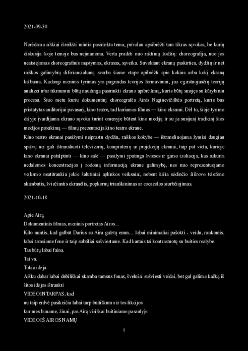Filmuojant poetinį portretą „Airos šokis“ (darbinis pavadinimas) susilaukiau prašymų iš operatoriaus Vytauto Pluko viską užrašyti, kitaip tariant, pateikti scenarijų — išsigandau, nes niekada nesu rašiusi scenarijų, nemoku to daryti. Galėčiau prieštarauti ir bandyti šį procesą palenkti į savo pasaulio matymo ir mąstymo pusę, tačiau nutariau, jog pastarąjį kūrybinį procesą bandysiu įgyvendinti pagal kinematografinius kanonus, jog artimiau susipažinčiau su kino gamyba, jos niuansais. Galbūt pasitelkusi kino kūrimui būdingas priemones priartėsiu prie aiškesnio suvokimo, kas yra ir kaip veikia kinematografinis mąstymas.