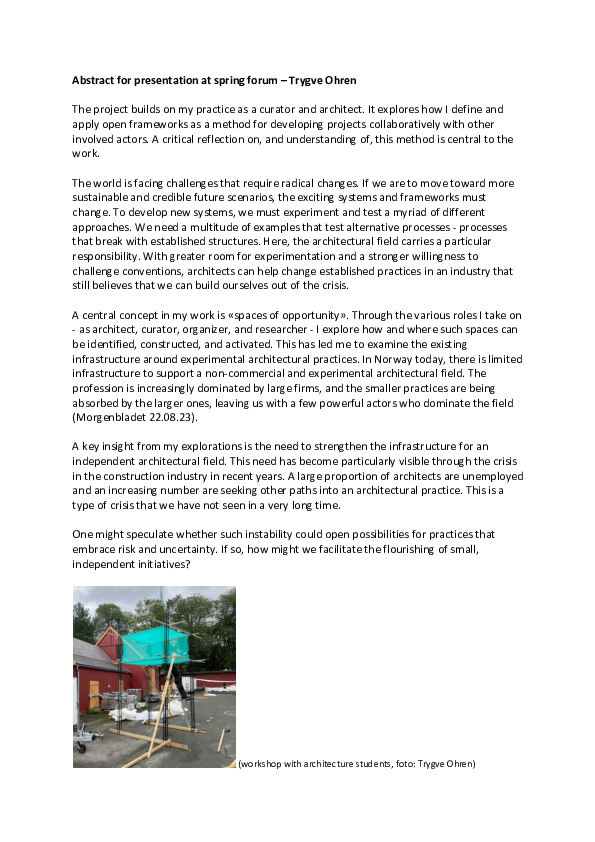 Trygve Ohren (1983) lives and works in Åneby, Hakadal. He has his MA in architecture from NTNU. Since 2010 Ohren has been collaborating with artist Charlotte Rostad on various projects, among them RAKE visningsrom (2011-2019) a project space for art and architecture in Trondheim. In addition Ohren is one of the founding partners of Nøysom arkitekter - most known for an experimental self build project at Svartlamon in Trondheim (2013 - 2017). Trygve Startet his PhD in October 2022 at the institute of architecture and planning at NTNU