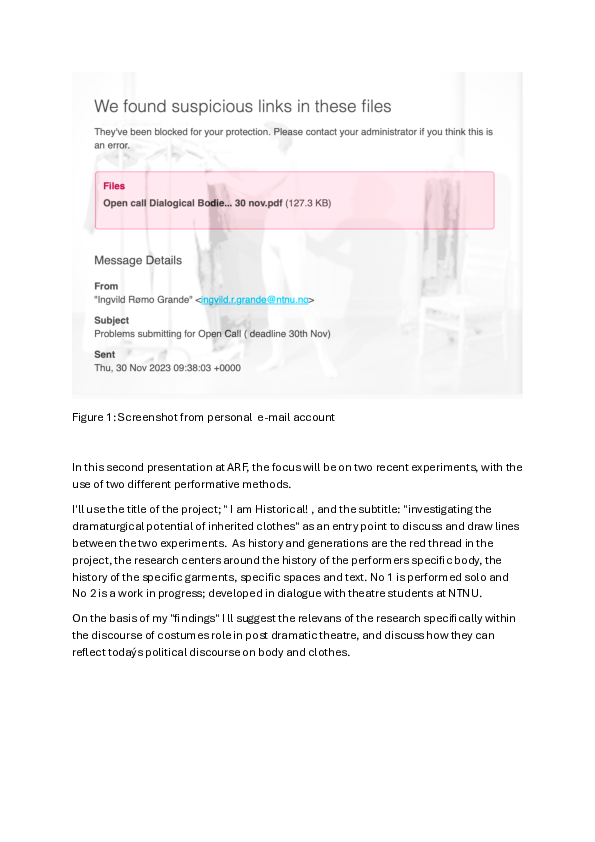 In the presentation at ARF 2023 I will suggest possible methods for the research, touch upon the ethical concerns, and discuss how the project could contribute to the field of costume, scenography and visual dramaturgy.