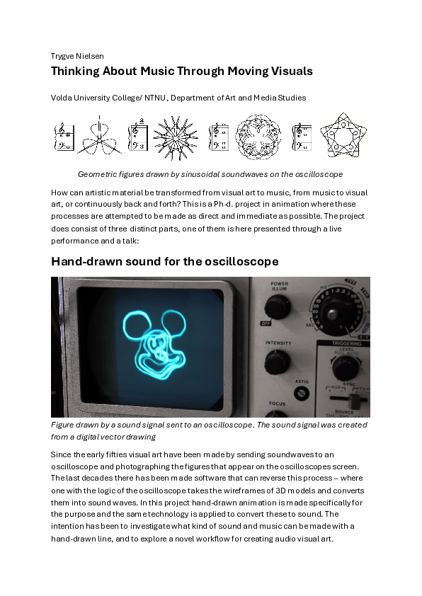 Learning about musical concepts or how to play an instrument does to an increasing degree take place through audio visual media. How can the artistic tradition of visual music benefit this communication? This is an artistic research project that produce works that suggest potentials and directions in this development, while also criticising or commenting on it. The project has its base in the field of visual music film, traditionally understood as films that produces shapes, colours and movement analogue to musical form. The output will consist mainly of short, animated films. While mostly focusing on the didactic potential of visual music the project does necessarily also engage in core questions of the field: is there a universal language of art, is there a unifying structure of aesthetics and meaning under the surface of music and visual art and is this structure derived from nature or from the human brain?