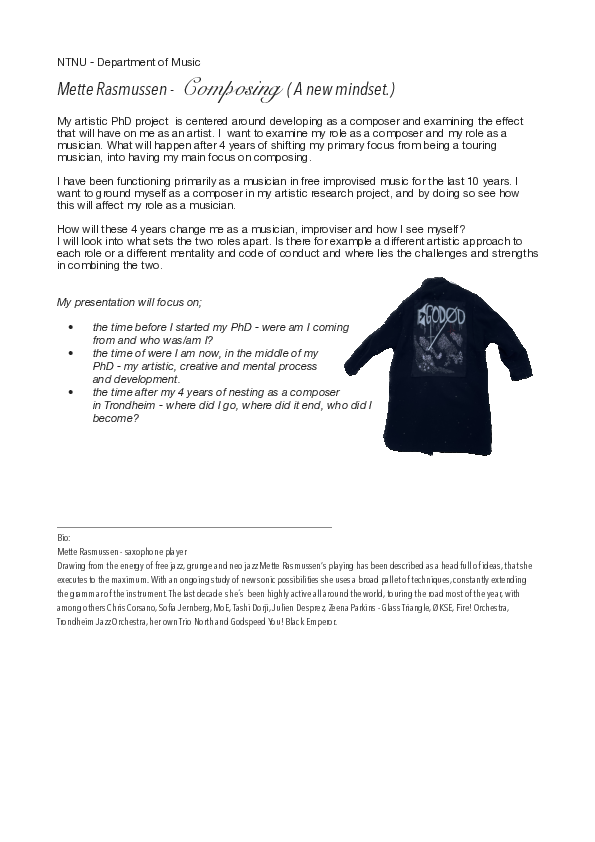 My artistic PhD project is based on exploring composition for ensembles that are mainly rooted in free improvisation. My goal is to find my own voice as a composer, by exploring my own personal inspirational triggers, such as; customised graphic notation, exploration of texture, small and large ensembles, use of cross genres, use of electro acoustic elements. In parts of my work I will be researching a texture based approach to composition, the emphasis on textures consisting of layers/blocks of material, based in timbre and extended technique. Aiming to seek out a new sound world, based on texture as a compositional tool. Blurring the distinction between timbre and harmony. Not unlike the mindset of spectral composers.