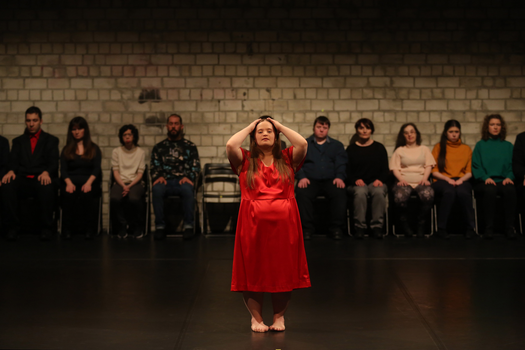 Image description: Performer Jelena Stefanoska stands barefoot at the center of the stage, wearing a red dress and looking forward with hands resting on her head. Behind her, a line of seated performers faces the audience, all dressed in various dark or soft colors. The background is a brick wall, creating a minimalist setting. The lighting focuses softly on Jelena, highlighting her presence against the somber arrangement of figures behind her.