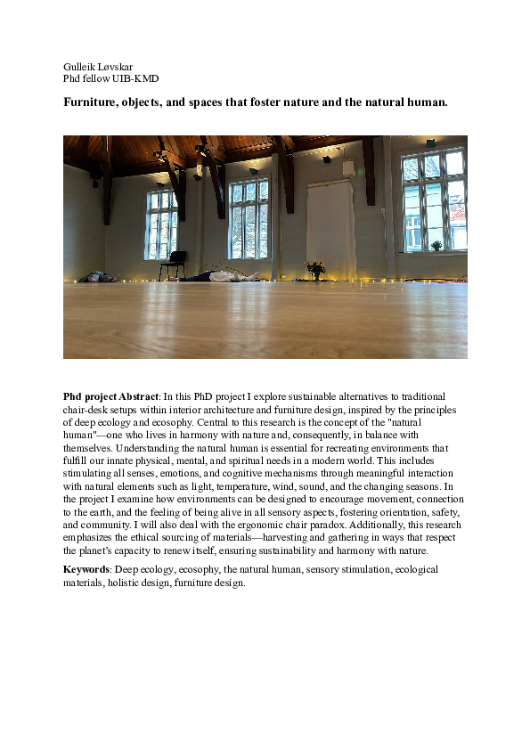 In this PhD project I explore sustainable alternatives to traditional chair-desk setups within interior architecture and furniture design, inspired by the principles of deep ecology and ecosophy. Central to this research is the concept of the "natural human"—one who lives in harmony with nature and, consequently, in balance with themselves. Understanding the natural human is essential for recreating environments that fulfill our innate physical, mental, and spiritual needs in a modern world. This includes stimulating all senses, emotions, and cognitive mechanisms through meaningful interaction with natural elements such as light, temperature, wind, sound, and the changing seasons. In the project I examine how environments can be designed to encourage movement, connection to the earth, and the feeling of being alive in all sensory aspects, fostering orientation, safety, and community. I will also deal with the ergonomic chair paradox. Additionally, this research emphasizes the ethical sourcing of materials—harvesting and gathering in ways that respect the planet’s capacity to renew itself, ensuring sustainability and harmony with nature.