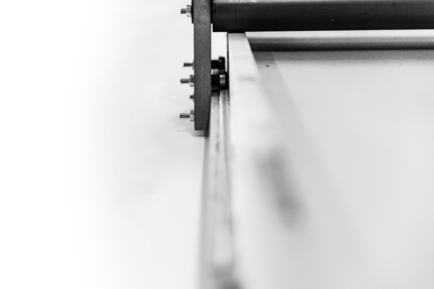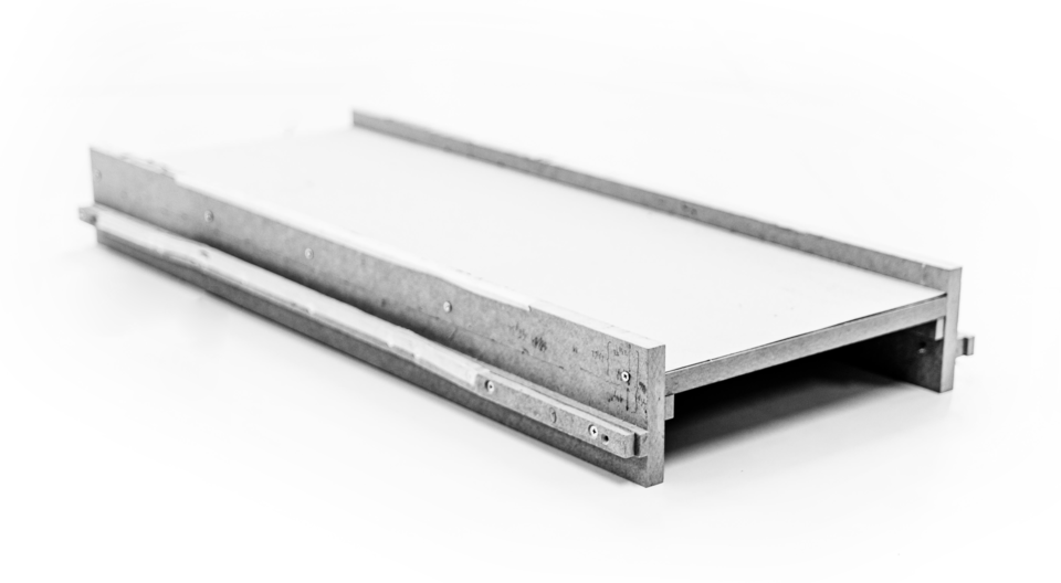 From these materials, the main parts were built. The printing base was assembled from the MDF pieces that were glued and screwed. The gutters, through which the ink rollers and the printing cylinder move, were also built with MDF. From 19mm MDF thick pieces glued together, the gutter was built in two levels for the back and forth movements of the cylinders. One of the levels is linear and the other has elevation and slope sections.