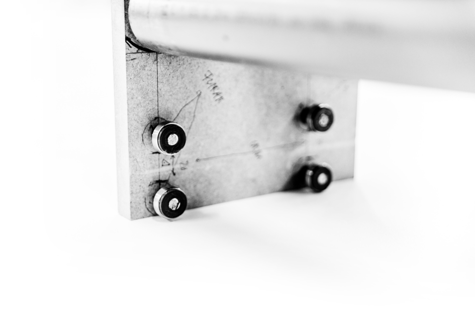 For phase 1, one MDF plate were used. They were pre-cut in the store in X parts. These were cut into X pieces to form the structure of the printing base, the gutters belonging to them and also the support for the cylinders. For that, It was necessary to use a table-top saw to cut the fine pieces for the rails. It is worth noting that this process can be accomplished with simpler and more affordable tools, aided by fablabs and even made from 3D printing.