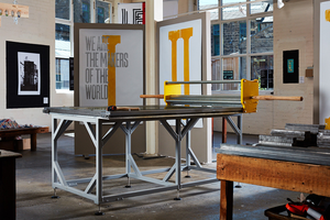 Built in 2019 by JKN OilTools in Batley, the People Powered Press is the largest letterpress printer of its kind in the world. Designed by design studio Split, the People Powered Press was made last year as part of their project and book These Northern Types. It is used by various groups of people, through writing and printing workshops, to make large format prints - with the purpose of amplifying the voices and words of local community groups - which are then displayed locally in both indoor and outdoor spaces. For its large size it was recognised by the Guinness Book of Records on 15 April 2019 as the world's largest letterpress printer. The first type made for this printer is called Graft, in honour of the JKN OilTools team, and was cut out of 720pt steel, accompanied by a set of giant numerals reaching 3480pt.