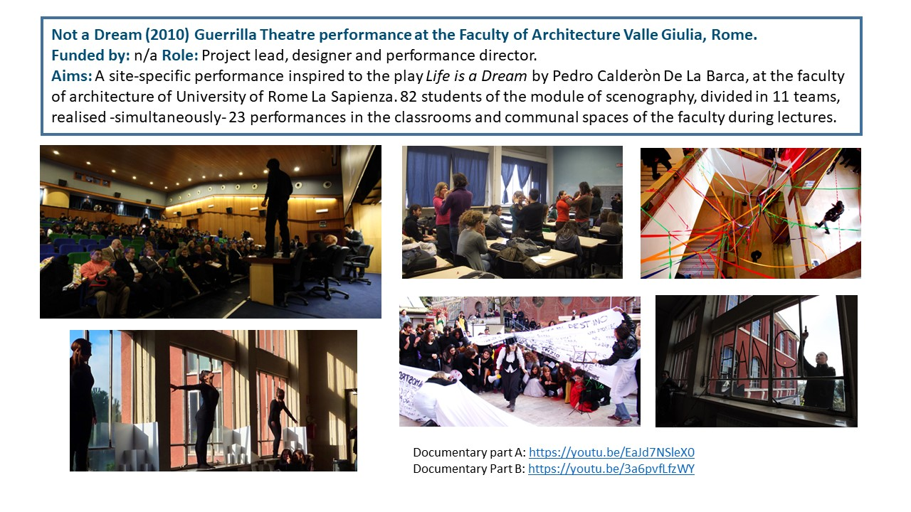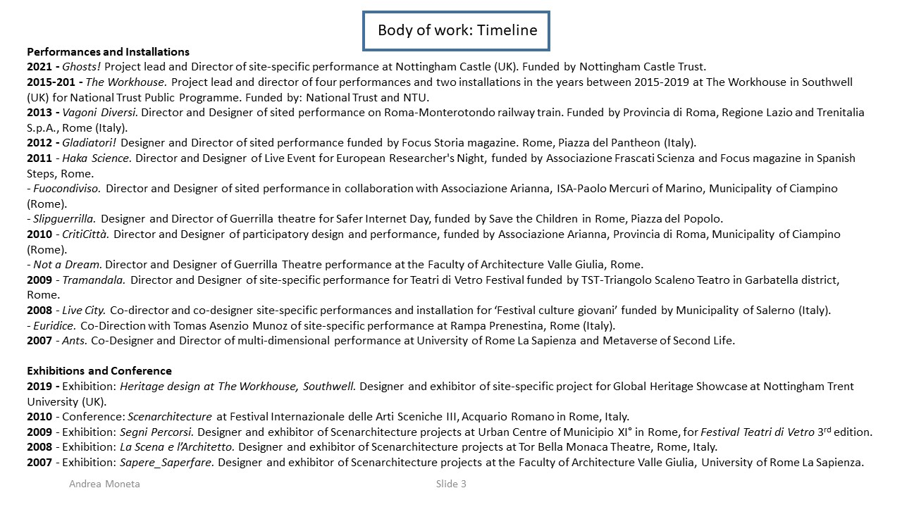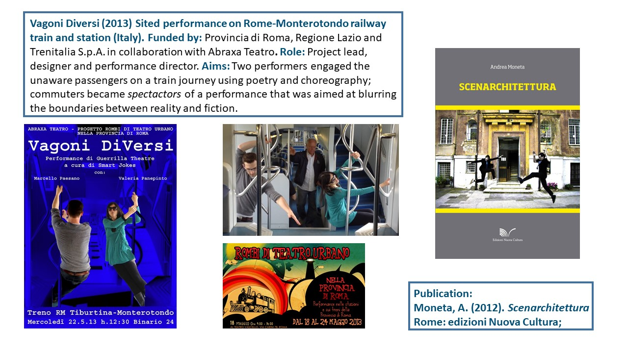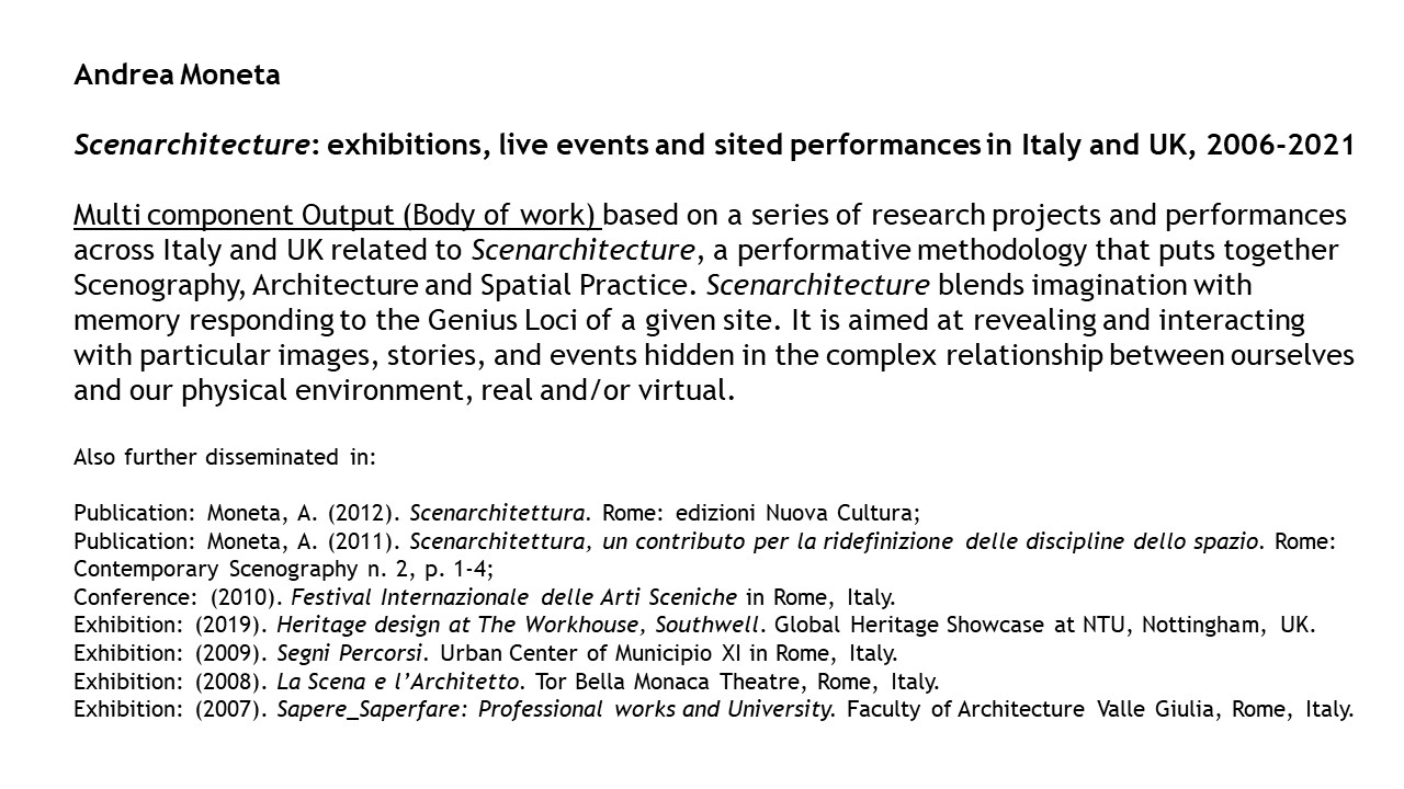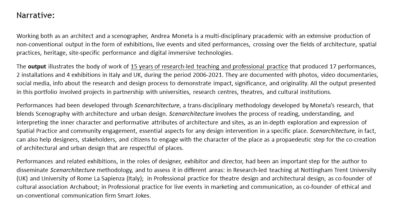 The Exposition illustrates the body of work of 15 years of research-led teaching and professional practice that produced 17 performances, 2 installations and 4 exhibitions in Italy and UK, during the period 2006-2021. They are documented with photos, video documentaries, social media, info about the research and design process to demonstrate impact, significance, and originality. All the output presented in this portfolio involved projects in partnership with universities, research centres, theatres, and cultural institutions. Performances had been developed through Scenarchitecture, a trans-disciplinary methodology developed by Moneta’s research, that blends Scenography with architecture and urban design. Scenarchitecture involves the process of reading, understanding, and interpreting the inner character and performative attributes of architecture and sites, as an in-depth exploration and expression of Spatial Practice and community engagement, essential aspects for any design intervention in a specific place. Scenarchitecture, in fact, can also help designers, stakeholders, and citizens to engage with the character of the place as a propaedeutic step for the co-creation of architectural and urban design that are respectful of places. Performances and related exhibitions, in the roles of designer, exhibitor and director, had been an important step for the author to disseminate Scenarchitecture methodology, and to assess it in different areas: in Research-led teaching at Nottingham Trent University (UK) and University of Rome La Sapienza (Italy); in Professional practice for theatre design and architectural design, as co-founder of cultural association Archabout; in Professional practice for live events in marketing and communication, as co-founder of ethical and un-conventional communication firm Smart Jokes.