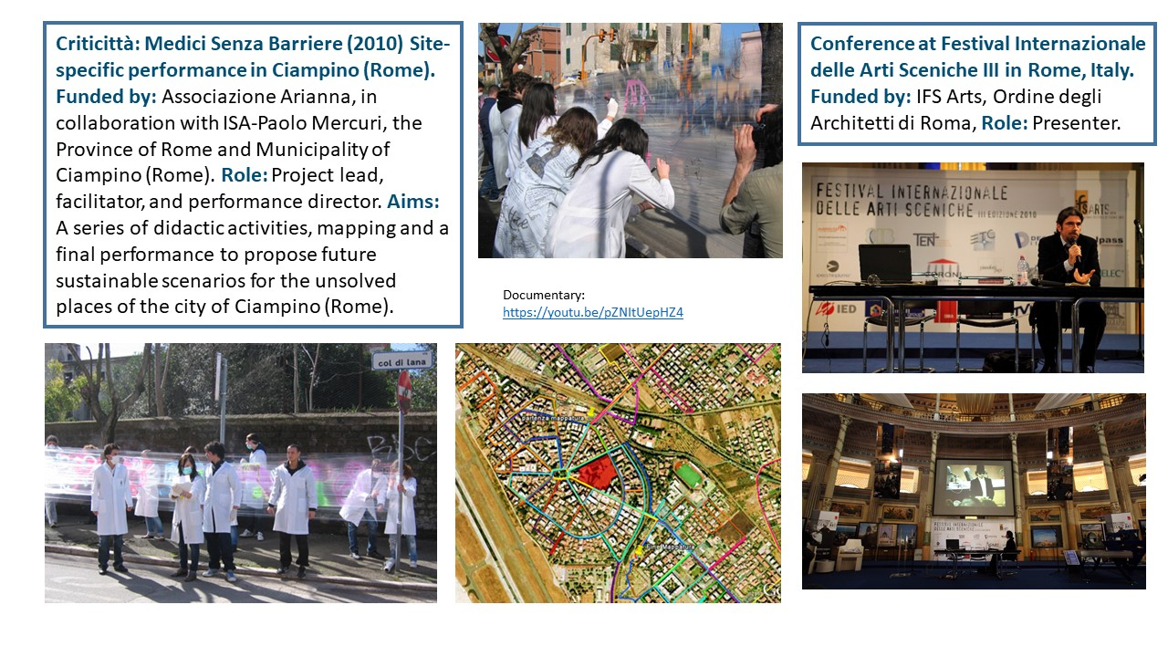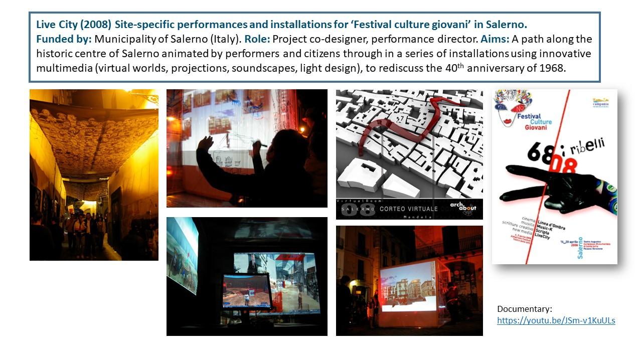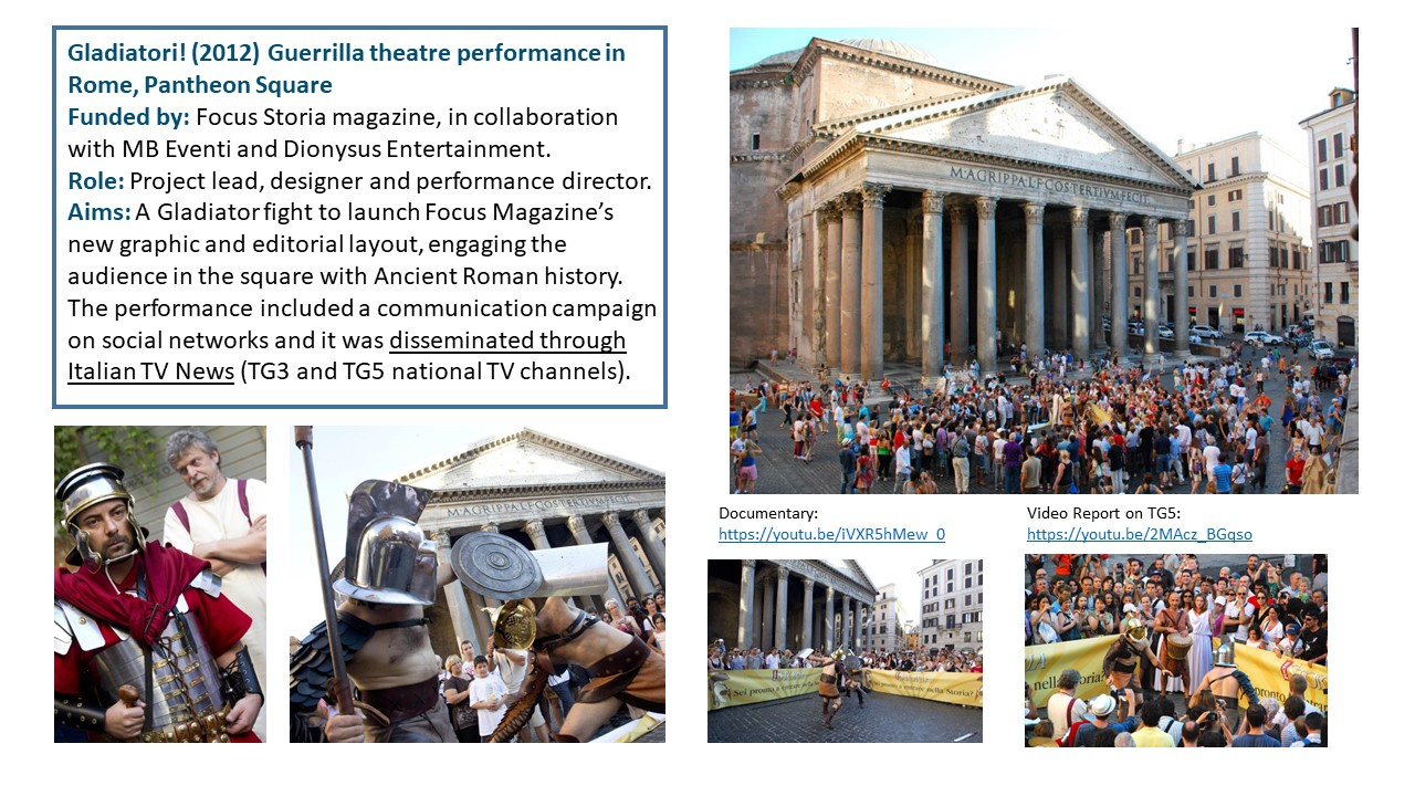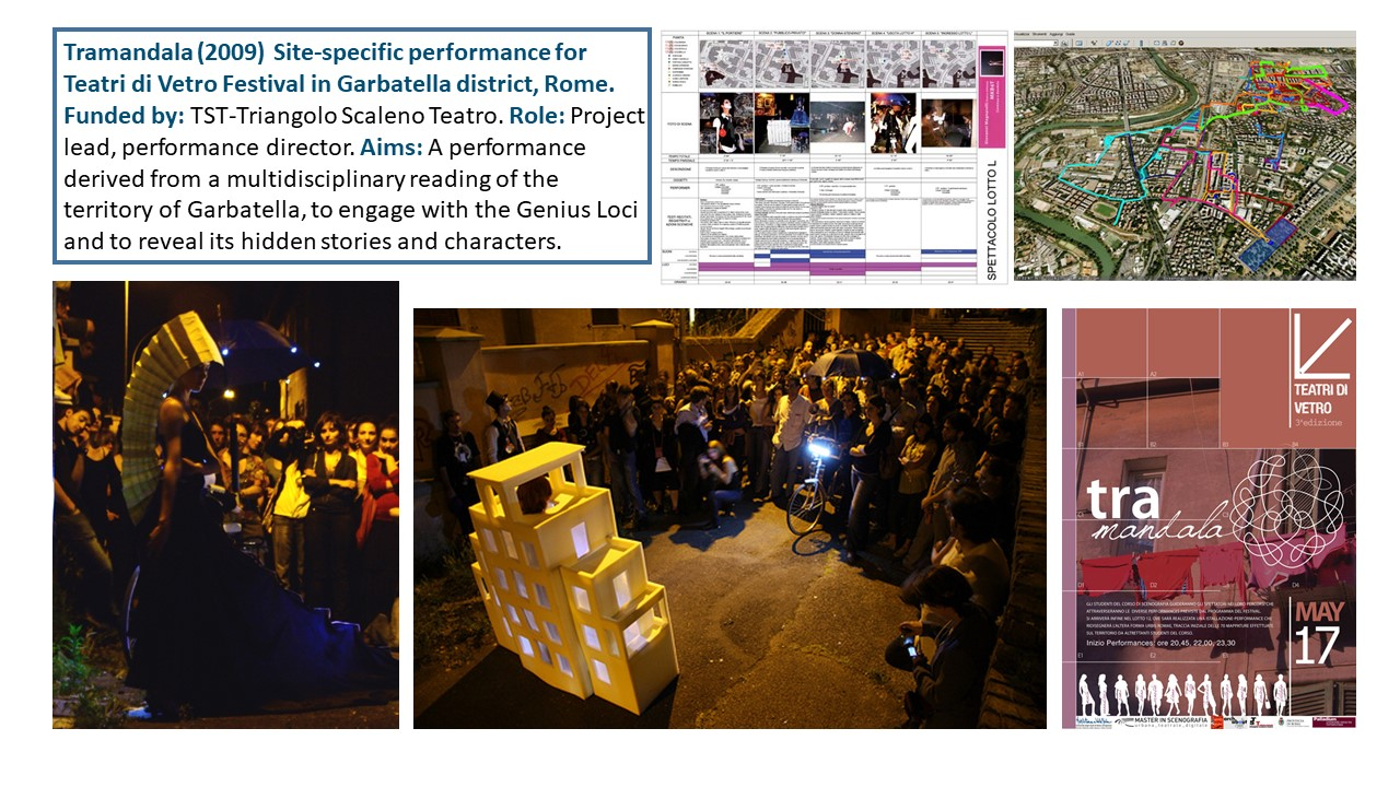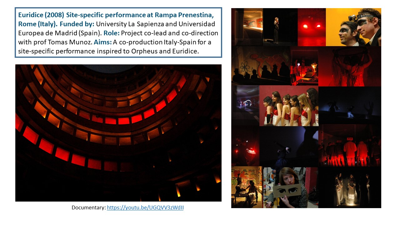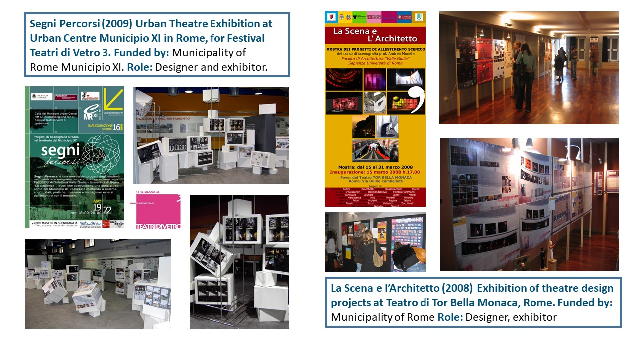 The Exposition illustrates the body of work of 15 years of research-led teaching and professional practice that produced 17 performances, 2 installations and 4 exhibitions in Italy and UK, during the period 2006-2021. They are documented with photos, video documentaries, social media, info about the research and design process to demonstrate impact, significance, and originality. All the output presented in this portfolio involved projects in partnership with universities, research centres, theatres, and cultural institutions. Performances had been developed through Scenarchitecture, a trans-disciplinary methodology developed by Moneta’s research, that blends Scenography with architecture and urban design. Scenarchitecture involves the process of reading, understanding, and interpreting the inner character and performative attributes of architecture and sites, as an in-depth exploration and expression of Spatial Practice and community engagement, essential aspects for any design intervention in a specific place. Scenarchitecture, in fact, can also help designers, stakeholders, and citizens to engage with the character of the place as a propaedeutic step for the co-creation of architectural and urban design that are respectful of places. Performances and related exhibitions, in the roles of designer, exhibitor and director, had been an important step for the author to disseminate Scenarchitecture methodology, and to assess it in different areas: in Research-led teaching at Nottingham Trent University (UK) and University of Rome La Sapienza (Italy); in Professional practice for theatre design and architectural design, as co-founder of cultural association Archabout; in Professional practice for live events in marketing and communication, as co-founder of ethical and un-conventional communication firm Smart Jokes.