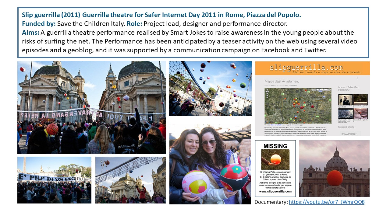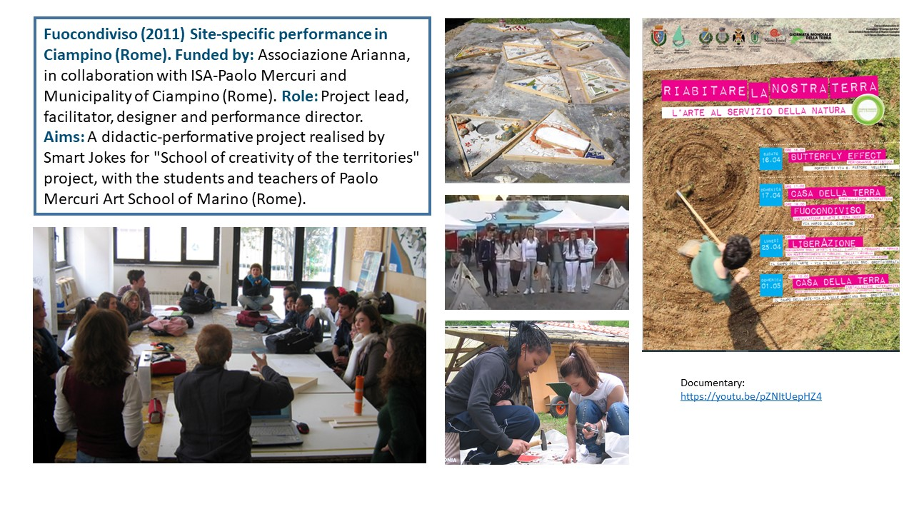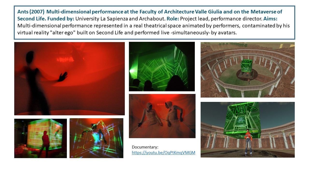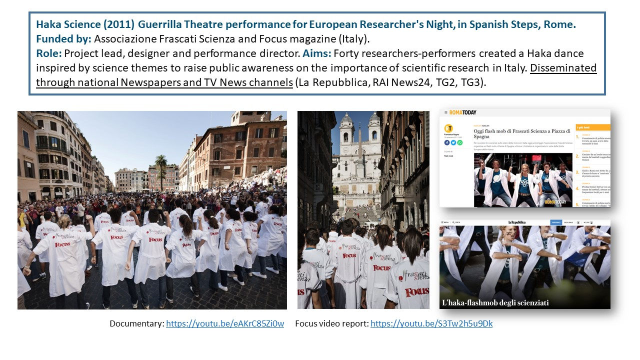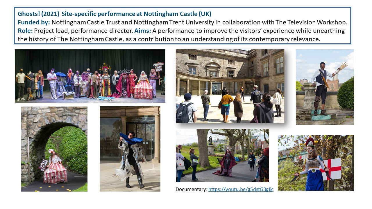 The Exposition illustrates the body of work of 15 years of research-led teaching and professional practice that produced 17 performances, 2 installations and 4 exhibitions in Italy and UK, during the period 2006-2021. They are documented with photos, video documentaries, social media, info about the research and design process to demonstrate impact, significance, and originality. All the output presented in this portfolio involved projects in partnership with universities, research centres, theatres, and cultural institutions. Performances had been developed through Scenarchitecture, a trans-disciplinary methodology developed by Moneta’s research, that blends Scenography with architecture and urban design. Scenarchitecture involves the process of reading, understanding, and interpreting the inner character and performative attributes of architecture and sites, as an in-depth exploration and expression of Spatial Practice and community engagement, essential aspects for any design intervention in a specific place. Scenarchitecture, in fact, can also help designers, stakeholders, and citizens to engage with the character of the place as a propaedeutic step for the co-creation of architectural and urban design that are respectful of places. Performances and related exhibitions, in the roles of designer, exhibitor and director, had been an important step for the author to disseminate Scenarchitecture methodology, and to assess it in different areas: in Research-led teaching at Nottingham Trent University (UK) and University of Rome La Sapienza (Italy); in Professional practice for theatre design and architectural design, as co-founder of cultural association Archabout; in Professional practice for live events in marketing and communication, as co-founder of ethical and un-conventional communication firm Smart Jokes.