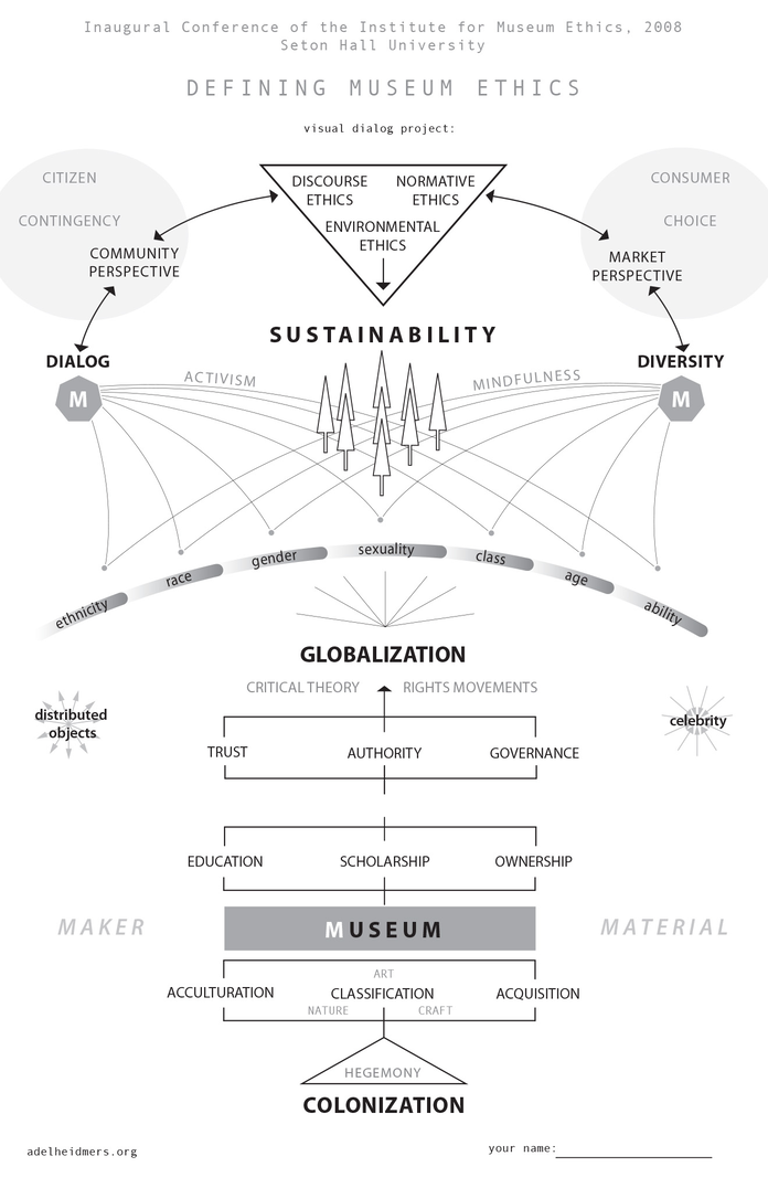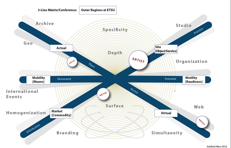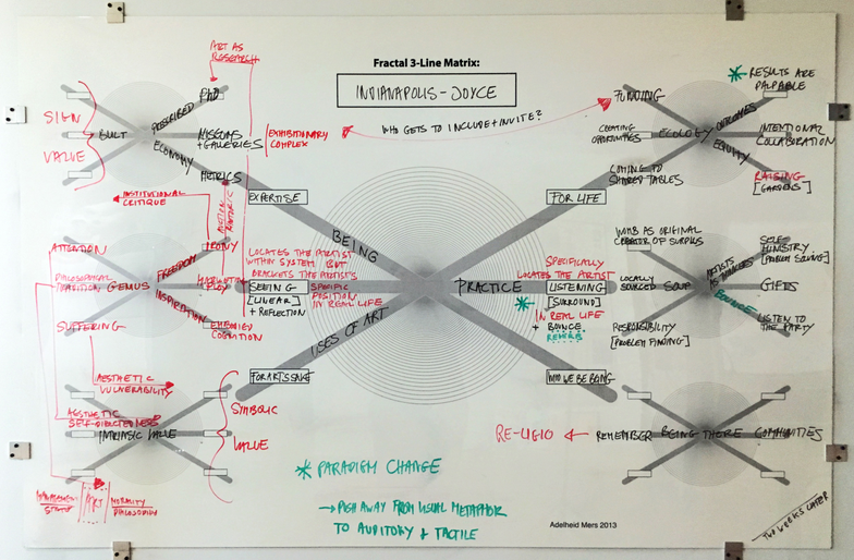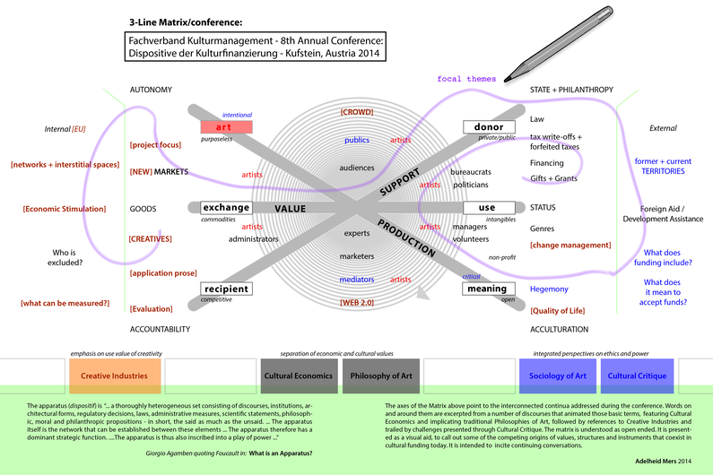 From 2008 to 2014, I drew up diagrams following several 'single track' conferences, at which I was able to attend all panels. These included a conference on Museum Ethics (2008), two conferences of the Fachverband Kulturmanagement (2011, 2014, both published in the proceedings), as well as a symposium on Research Cultures at the University of Music and Performing Arts, Vienna (2013, draft presented for discussion and development at a closing event l, and final poster to attendees distributed post-symposium), and the "Outer Regions" convening at East Tennessee State University. The Fractal 3-Line Matrix evolved from and through these exercises in consolidating large amounts of information, and became an instrument for the notation of conversations about cultural ecology and artistic practices. I drew on these experiences when attending the "Artist as Problem Solver" convening in Indianapolis, in 2018.
