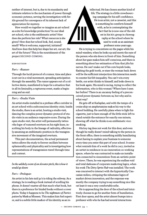 SECOND COMING is scored artistic research commitment in the form of a text. Set in an issue of a journal focusing on artistic research, the text is uncovering choreographic structures of mystery. The score SECOND COMING can be divided into three or two parts, or in the worst case scenario, presented as an elevator pitch.