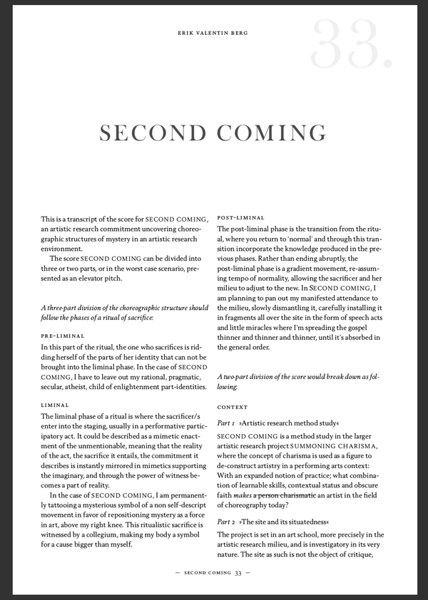 Through publishing the text, it becomes a part of the choreography of SECOND COMING. It is a transcript of process, time, outcomes, belief, convergence and faith. It incorporates elements from autofiction, project description and rituals. When it works, it is (still) a mystery.