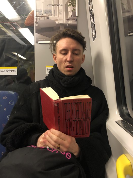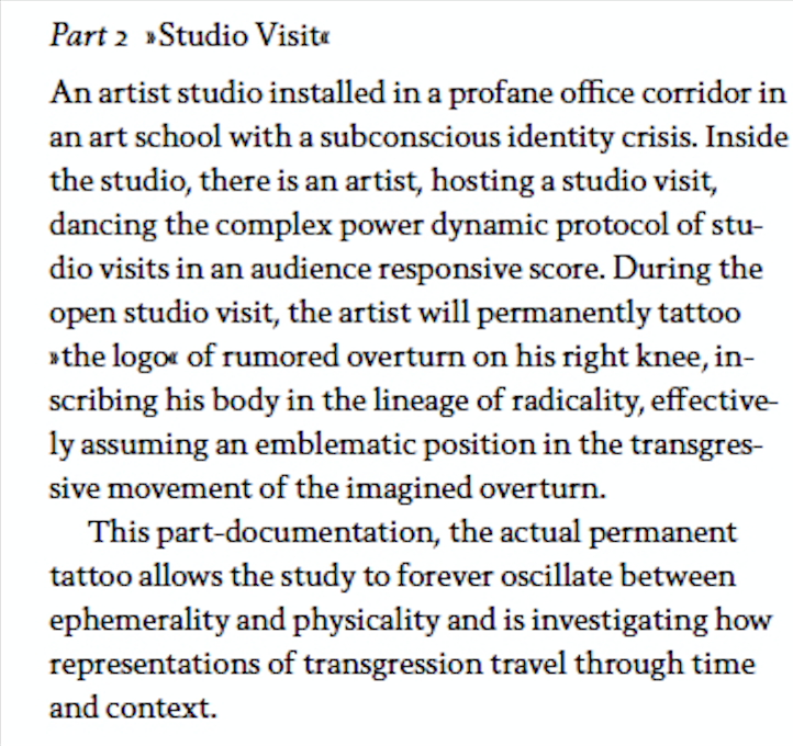 The artist was just about to lit fire to a cigarette two meters outside the door of a Stockholm montessori school, absorbed by his fantasy, somatically experiencing the touch of falling through thin air at the speed of 120 mph (200 kph), and with a reflex resembling pulling a parachute, he put his lighter back into his right front pocket of his skinny black jeans, looking down on his vegan edition Dr. Martens shoes. He realized, he had had an unfair assessment of the possibilities of artistic research, that his very generalized critique of the field as vague, too academic, and at a safe distance to the real world of art production was merely a question of framing. That his preconceived notion of artistic research as “not for him” stemmed from his complex relationship to the term practice based, as he had trouble fitting his image of his practice into the discourse of artistic research. That it was a question of seizing the opportunity to take part in the development of the discourse, through putting his practice as a research object through a project serving as a vehicle for a discussion of what constitutes artistry in post-conceptual choreography. Maybe, the artist mumbled to himself. If there is the possibility to teach in conjunction with the research, wouldn't that be something. He recalled what Joseph Beuys had said, when he, as his last act as vice chancellor of prestigious art school städelschule in Frankfurt, dismantled the whole admission system and decided to grant everyone who applied to the school: