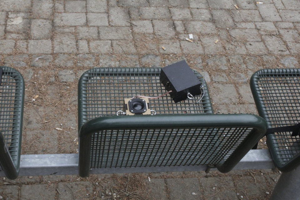 Detect-space issues a series of so-called sweeps, chirpy sounds lasting a few seconds that move from lower to higher frequencies. By observing the echoes of this sound, the node creates an internal image of the (geometrical) space around it, translated into distances of reflecting surfaces. This image subsequently informs the parameters of all other modes, most perceivable in space-timbre which translates these distances into frequencies, creating an internally modulated harmonic or inharmonic sphere. When multiple nodes happen to be in the space-timbre mode at the same time, one can easily notice the different harmonic spheres obtained from the individual locations of the nodes.