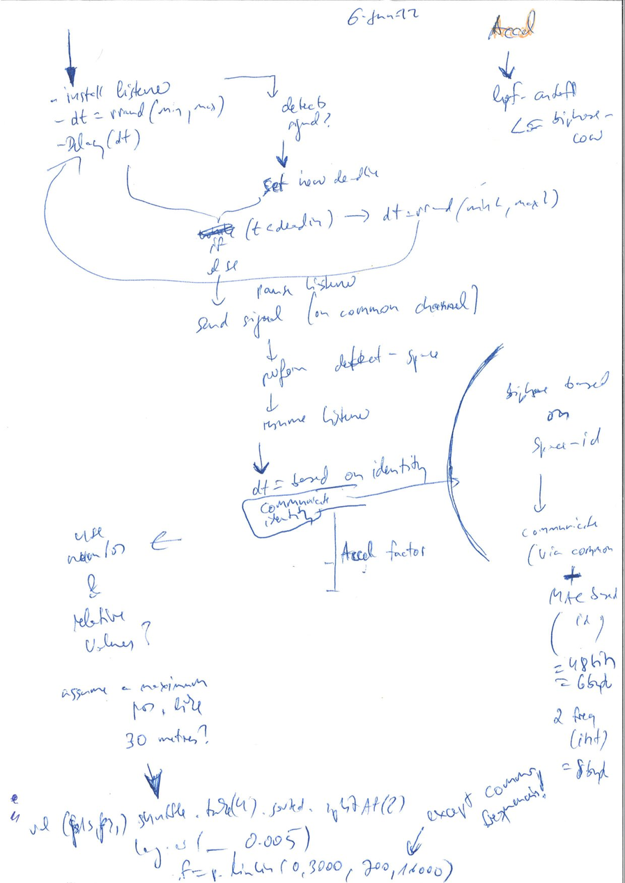 The next steps would be to anncounce the “individual communication frequencies” based on the space detection, and to listen to them from the other nodes (register the announced frequencies). The crypsis algorithm should sound more like breathing, i.e. a longer release and perhaps a resonance in the attack. The biphase-enc should probably also fade in and out with more idle bits.