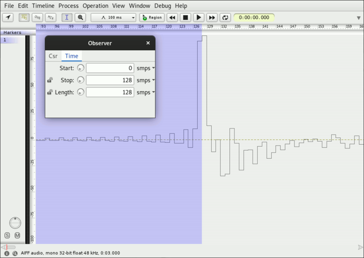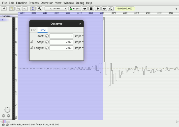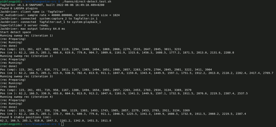 It's possible to run the IR measurements with direct code, avoiding the Control/Ex code. Thus, I created a separate repository for the code. It took me a long time to figure out the idiosyncracies of the Pi's sound card. It seems it goes to “sleep” when there is no signal, even though SuperCollider and Jack are running. As a result, there are severe delays and gaps when beginning to play sounds. A workaround is to place a -70 dB noise signal on the line. There are still inexplicable variations in the latency between playing through the speaker and picking up the microphone, that should not happen, and that do not happen on the laptop. This makes comparison of recordings additionally hard.