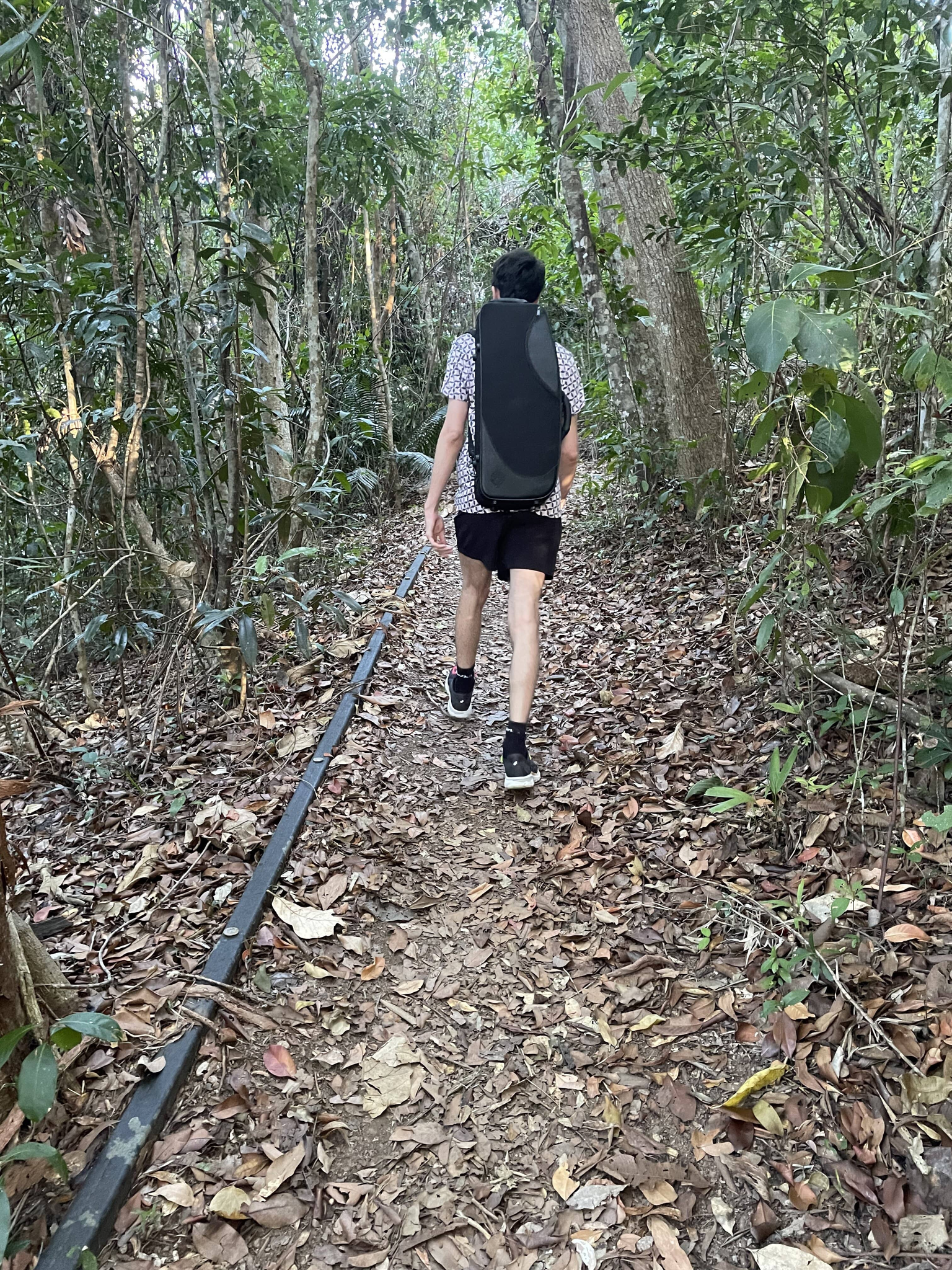 As a way of engaging with places with which I already have kinship, the site for the musicking was a rainforest-covered mountain on unceded Djiru Country on the east coast of Australia that is today known as Bicton Hill and is located roughly 30 kilometres from my hometown on unceded Gulngay Country. My childhood was spent snorkelling around and walking on nearby islands, and this is a place I have hiked along many times before this musicking. Drawing on what artistic researcher Vanessa Tomlinson (2019: 21) outlines as six categories of musicking that intersect with place and more-than-human subjectivities (‘recording the environment for use in compositions’, ‘listening to the environment to prepare for compositions’, ‘site-specific environmental performances’, ‘constructing an environment in which listening will occur’, ‘harnessing the environment to make sound’, and ‘using environmental data to make compositions’), this week-long engagement is a series of site-specific environmental encounters. Tomlinson (2019: 21) writes that when engaging in this largely improvisatory modality, the musician is ‘drawing attention to particularities unique to the site inclusive of resonance, ambience, and climate’, which emerge as ‘a dynamic experimental process’ and, as I will argue, might engender the possibility of kinship.
