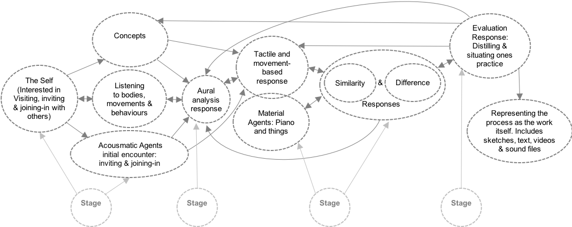 The research began with my curiosity to attend “otherness”, looking into the interface of connection during social sound engagements with the other from the composer’s point of view. I look into the relational interface through a series of epistemological postures, informed by strands of feminist, new-materialist, and non-anthropocentric perspectives. My incentive is to explore and offer relations that are experienced through social, embodied, and entangled sound practices through investigation of multicentered and generative acts. And so, with the model, I offer a practice that reads 1) every act as relational, 2) every relation as happening with an active embodied agent, and 3) propose a series of acts explored through web of social connections, highlighting relational-ontological positions.