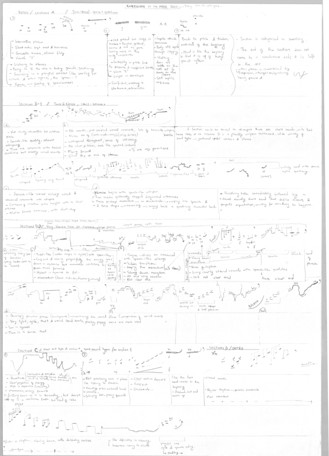 Working with Sumru was something I always wished for. I asked her to sing free improvisations within a sound-based approach, and what could be called a contemporary style of improvisation. I provided her with the energy/motion companions, called the Temporal Semiotic Units, and asked that they function as companions for her improvisations. She has kindly accepted my invitation and immediately sent me recordings of her acousmatic presence, where she inhales and exhales five short improvisations. I chose to work with the one that spoke to me most, number three.