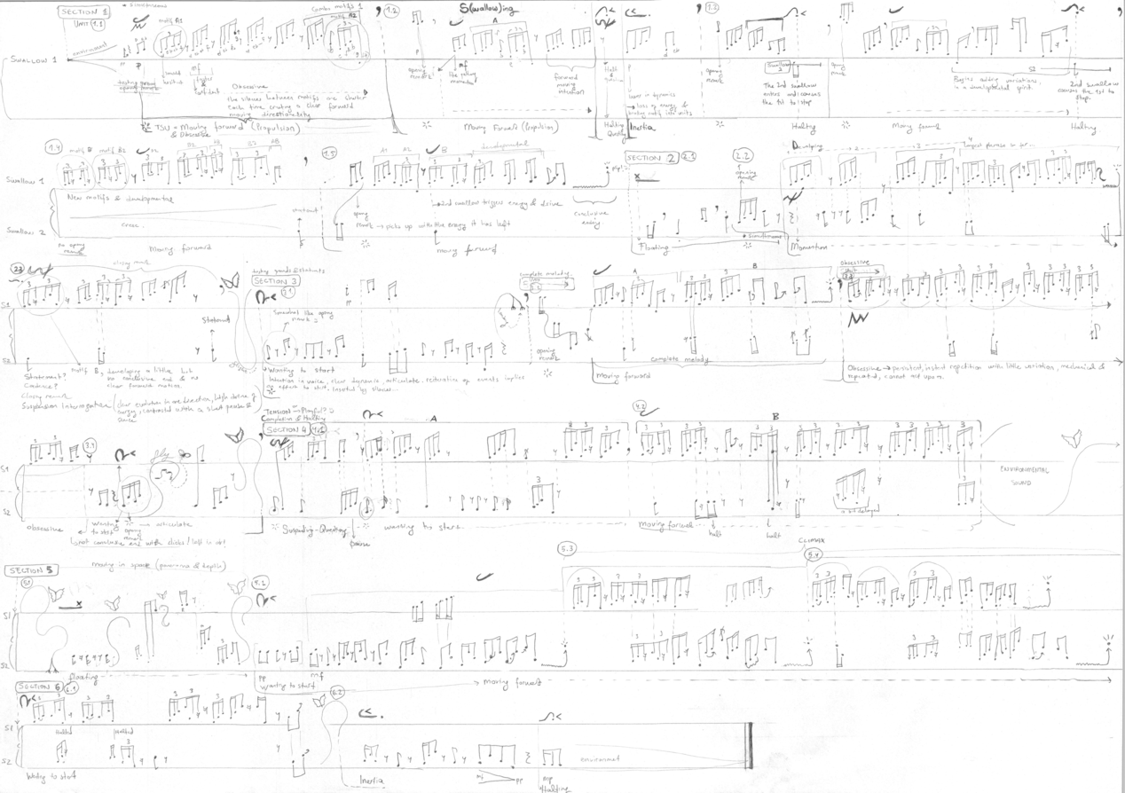 As the swallows were singing their importance, and their relations with others, they heard me opening the window about two meters away from them, and saw me seeing them, yet did not fly away. Although, they stopped singing for a while, shortly after, they continued. I cannot not think that hearing and seeing me have affected the way they sound and behave. From that angle, can I say that their sounding was partly including a response to me? Or does this type of thinking fall into the obvious trap of a series of anthropocentric thinking? Moving past these questions, and coining the self as a witness (that was affected and may or not have had an affect), I consider that all three of us, less than three-meter proximity; we did something, and we did it with the awareness with each other.