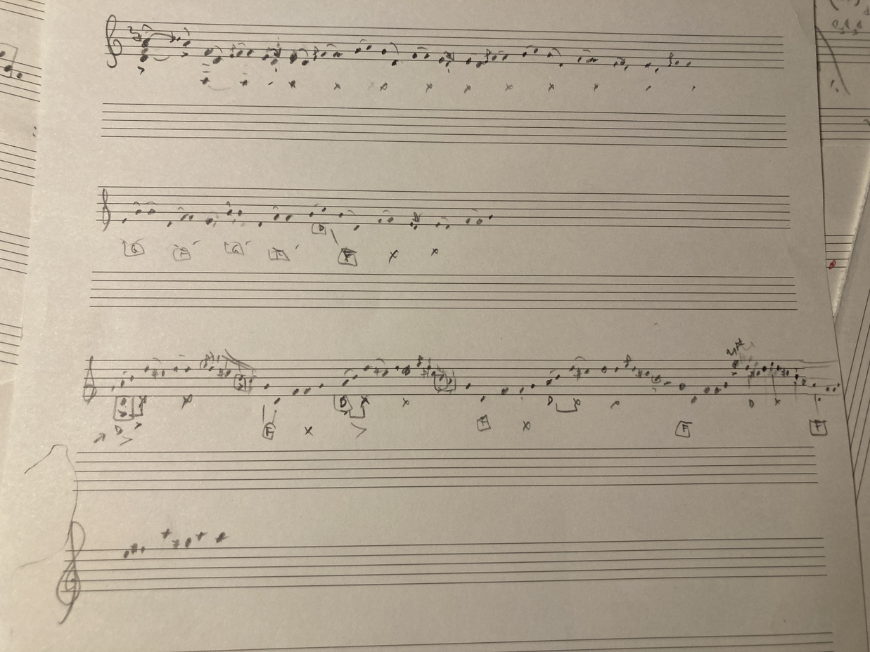 Jeg trekker fra til jeg står igjen med enkelttoner. Jeg lytter til én streng og leter etter hvilken samtidig tone som påvirker den hvordan. Jeg leter etter overtoner, understrenger, en rå og nær lyd som får bli ved strengen; lavmælt for å høre de bakenforliggende svingningene. Jeg holder tempoet tilbake for flygelkroppens lange strenger, for ørenes tid, for å beholde fokuset på hver vibrerende streng, for å høre slåtten i flygelstrengene.