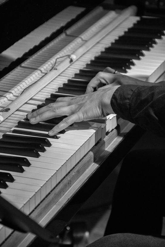 Fra en hånd som holder i tre med hestehår, fører diagonalt opp og ned, letthet i håndledd, drag med arm, løft mot luft, en hånd og hake som støtter klangkassen, vibrerende strenger strukket over tynn trestol – til to underarmer likt plassert foran kroppen, hengende fra skuldre forankret i et haleben, tyngdekraft ført gjennom albue, håndledd, fingerledd, ned i tangenters vekt, hammers oppoversprett, filtdempers løft, et basseng av strenger i en diger klangkasse, håndens bevegelser ned og opp som løfter lyden ut og opp av bassenget.