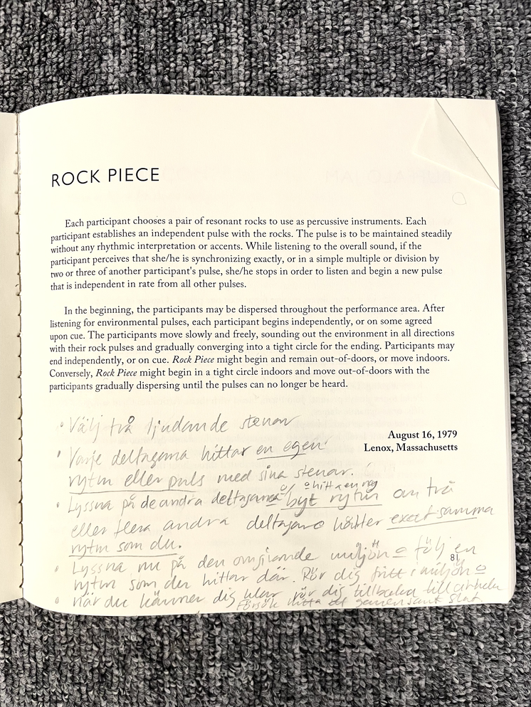 I was unsure whether Pauline Olivero's text score "Rock piece"* would work in this group. I thought it would maybe be too fuzzy? It certainly was not. Despite the location being windy, making it nearly impossible hear the rocks tapping, the sheer determination and concentration of the group, made the excercise make sense.