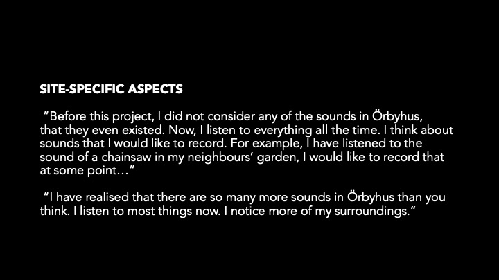 The research project FACT stage one aims to test the sonic capacity of fragmenturgy (developed by Sunesson 2014–19) as a method to unsettle polarised positions of areas and sites existing outside of the visual power structures and political strongholds. The long-term purpose is to develop a Fragmenturgy ACtion Tool (FACT); a transitory toolbox for cultivating fragmenturgy methods and actions. FACT stage one consists of a comprehensive case study carried out in collaboration with a group of students aged 18–23 based at Uppsala Community College in Sweden, which was explored as a site during 2021. Image copyright: Christina Hillheim