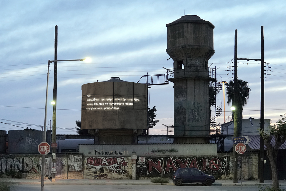 The interdisciplinary research project Tell Me (2021) is inspired by the geophysical landscape of Patras (the third largest city in Greece) and from the contemporary action of the city's working class. It analyses their discourse, visually documents individual memory and aims to create a literate and sculptural environment that promotes public dialogue and highlights language as an artistic medium. During the research process various topics are introduced; the value of scale as a means of understanding the urban landscape, the relationship between individual memory and collective truth, how individual myths shape collectively communities and cities and finally, how the public domain is being formed through the translation of language to mass. Tell Me is making an attempt to provide an account and – both artistically and in a semiotic way – overturn the post-industrial landscape of Patras by recalling and converting individual and collective memories which have shaped the modern city.