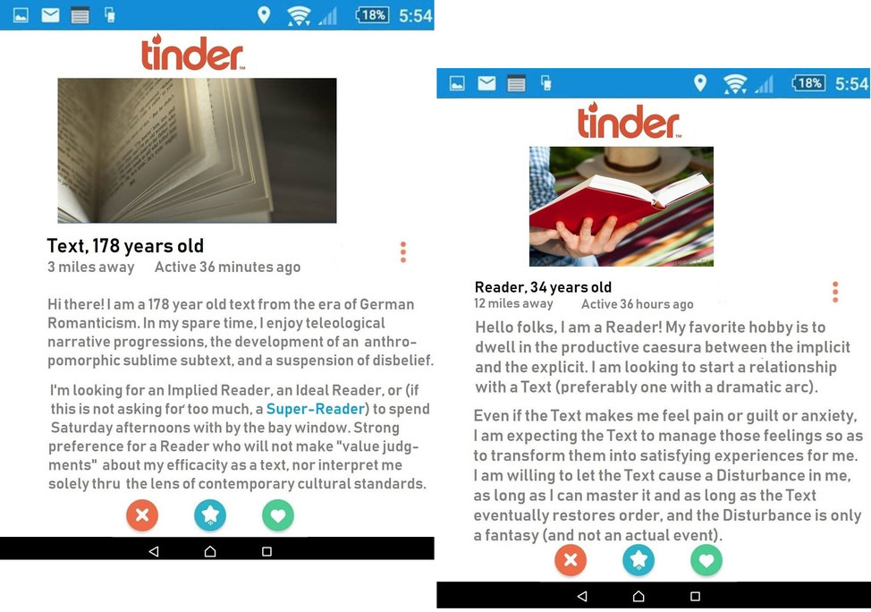 A Text and a Reader (person who reads) go on a date. The Text advertised for itself on Tinder: “Average number of signifiers, looking for a companion who will activate me, preference for Ideal Readers or Super-Readers.” The Reader was looking for something to occupy him/herself on a 10 hour airflight, so she decided to take up with the Text.