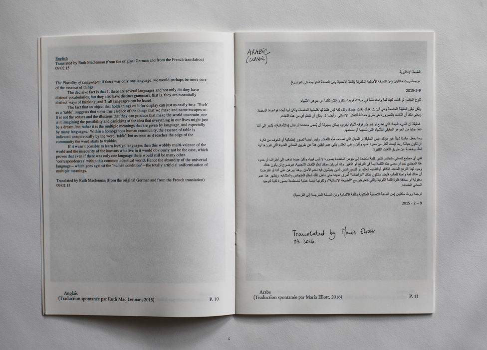 At the heart of this project, initiated in 2015 by artist Amélie Mourgue d’Algue, and presented at the 2016 SAR Conference Writing as a practice, Practice as writing, is the process of translation. Plurality of Languages is an ongoing project that experiments with the immersive encounter with languages to be experienced as an oscillation between thing and sign, between noise and sound through the reading of translations of ‘Pluralität der Sprachen’, an entry dated November 1950 in Hannah Arendt’s Denktagebuch published in 2003 by Pieper Verlag.