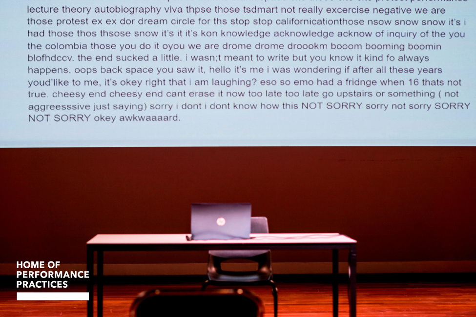 I am intrigued by art forms that suggest an intersection between art and theory, such as the performance lecture. My first exploration of the medium was my master’s graduation work i like the longer version more than love and anarchy. During this solo piece, I talk and write simultaneously and nonstop for 45 minutes. The written text, which I type on the laptop, is projected behind me, and my voice is amplified by a microphone. In this iteration of nonstop languaging, the gaps between words do not exceed the milliseconds a breath lasts or the millimetres of blank space between digitally written letters. The result is an overload of words, thoughts, citations, experiences, lyrics, theories, and memories, all seeking their own linearity. Although fragments of the text refer to events of the past, the performance intends to be an articulation of the continuous present in the ephemeral encounter between performer and spectator.