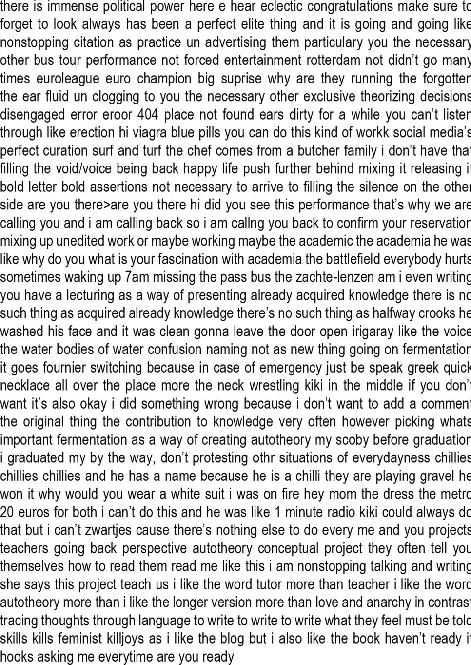 Another example is my article for the Special Issue of the Arts Journal: Autotheory in Contemporary Visual Arts Practice (2022). The main text was created during a series of radio performances, with a focus on methods of transcription and citation. Although there were compromises that needed to be made for the practice of nonstop languaging to appear in this context, during the process I was given more space to follow my own parameters than the first time I disseminated this research (MA dissertation). The experience enforced my belief that through a critical mass of works that merge the personal with the theoretical, that foreground different linearities, and shape an audience of engaged listeners, the confinements of knowledge production and dissemination within artistic academic discourse can be renegotiated.