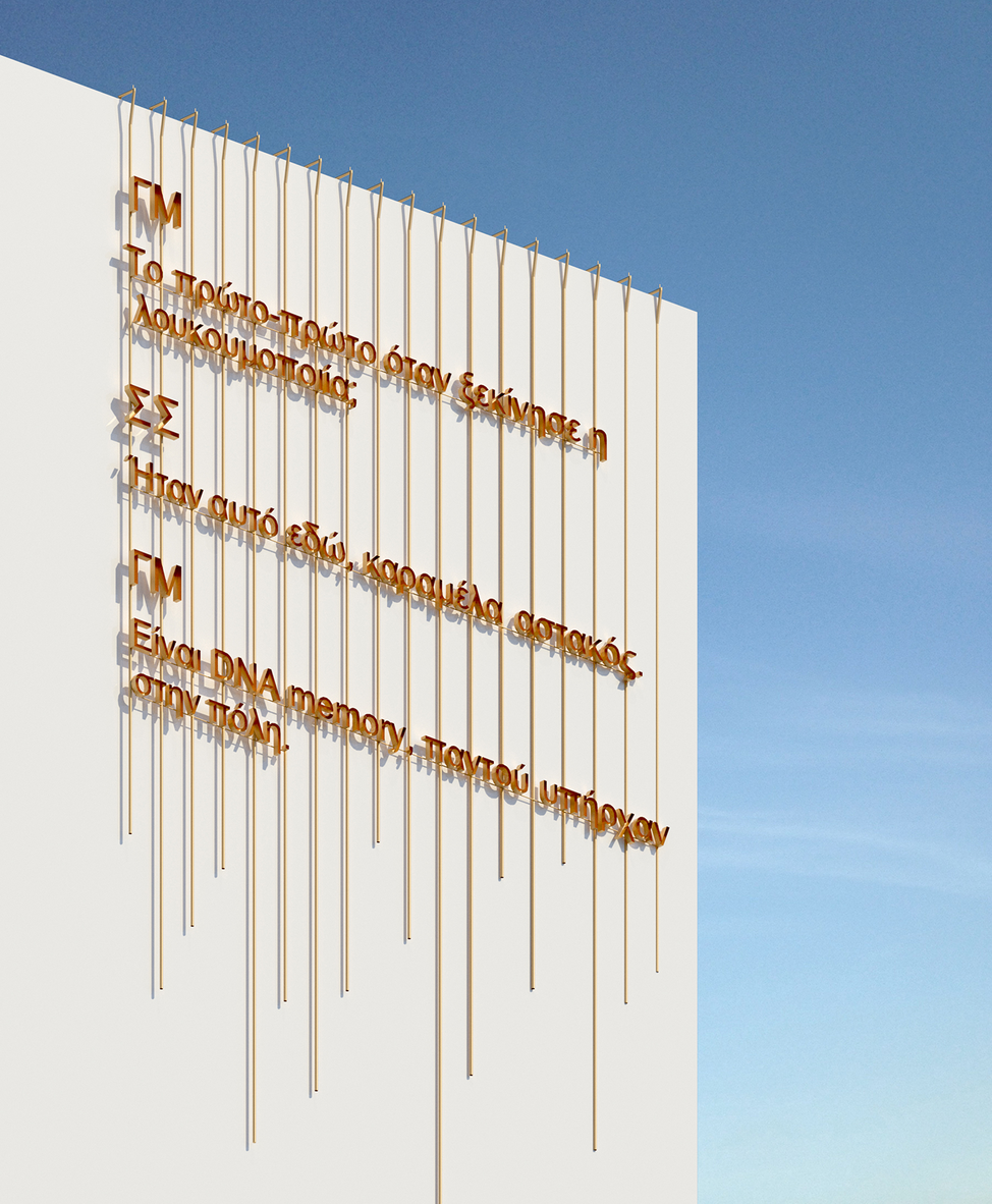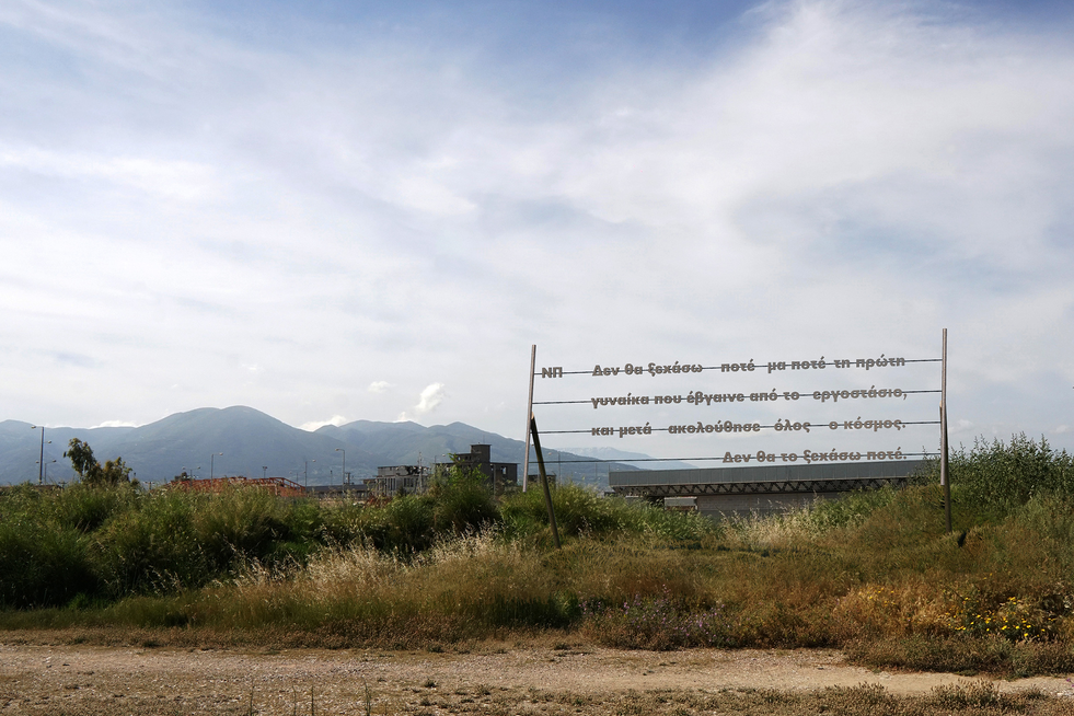The interdisciplinary research project Tell Me (2021) is inspired by the geophysical landscape of Patras (the third largest city in Greece) and from the contemporary action of the city's working class. It analyses their discourse, visually documents individual memory and aims to create a literate and sculptural environment that promotes public dialogue and highlights language as an artistic medium. During the research process various topics are introduced; the value of scale as a means of understanding the urban landscape, the relationship between individual memory and collective truth, how individual myths shape collectively communities and cities and finally, how the public domain is being formed through the translation of language to mass. Tell Me is making an attempt to provide an account and – both artistically and in a semiotic way – overturn the post-industrial landscape of Patras by recalling and converting individual and collective memories which have shaped the modern city.