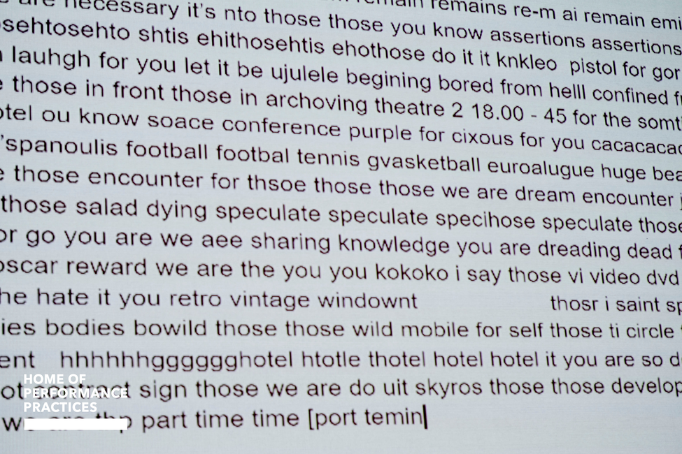 5. Algorithmic translation application translates granulated Finnish into English subtitles, which brings the serendipity of meanings into play and also acts as the textual subconsciousness of the performance producing constant slips and glitches.