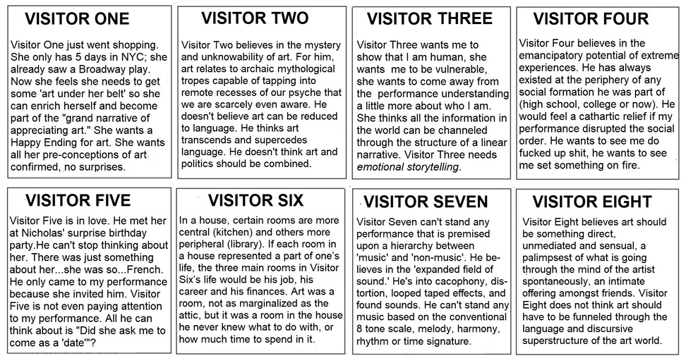 In any given performance, there is a vast reserve of untapped resources: the audience. Visitor One thru Eight (2016 - 2019) is a performance of mine where I inhabit the role of 8 spectators who have come to my performance.  Visitor One wants to be integrated into the grand narrative of appreciating art. Visitor Two believes in the mystery and the unknowability of art. Visitor Three believes in the emancipatory potential of extreme experiences. Visitor Four yearns for linear and emotional storytelling. Visitor Five believes art should be something direct and visceral, an intimate offering amongst friends. Each Visitor is a hypothetical speculation on an audience member.