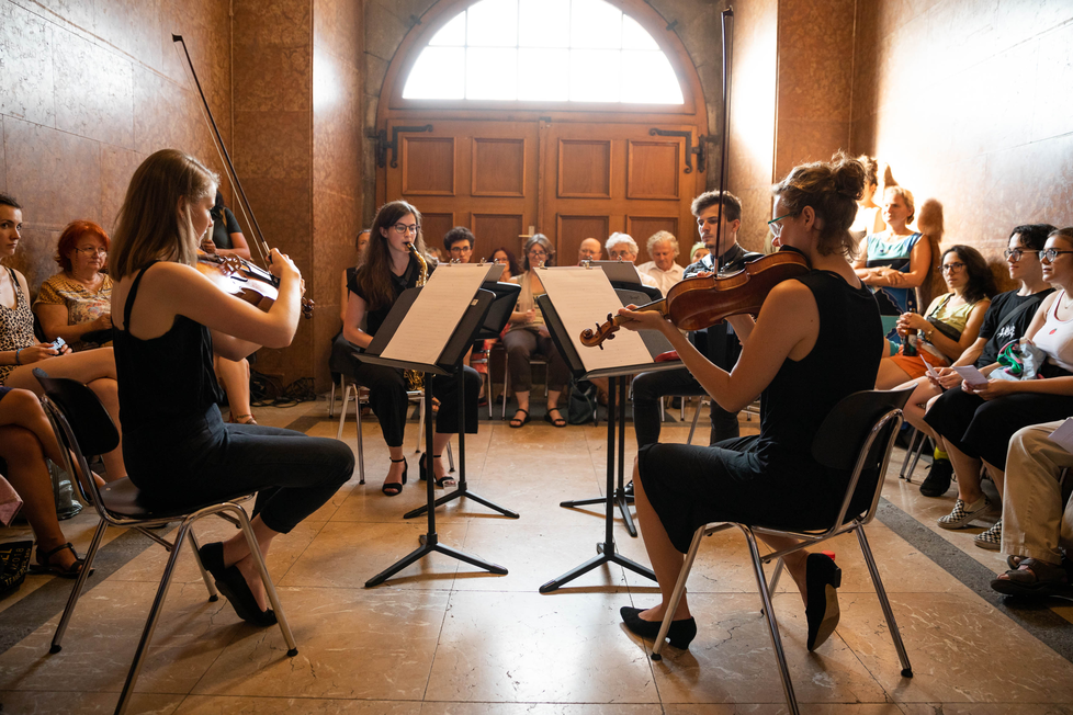 4. Sarah Rinderer, » - . ! :,concert performance, violin: Olga Akhtyrska, viola: Lea Gisler, saxophone: Lisa Felbermayer, accordion: Jakob Steinkellner, 2019, © Jürgen Gründwald