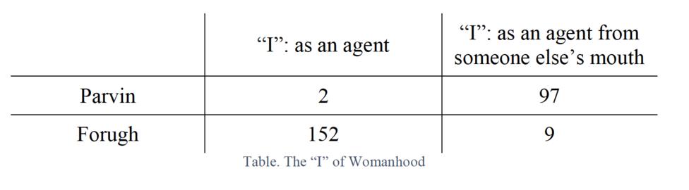I found two types in which the poet referred to herself. The following table displays the cases. As the table shows, Forugh puts herself in a powerful position in relation to the universe around her. In almost half of her pieces she boldly talks about herself being the source of action, while Parvin puts her agency mostly in others’ words.