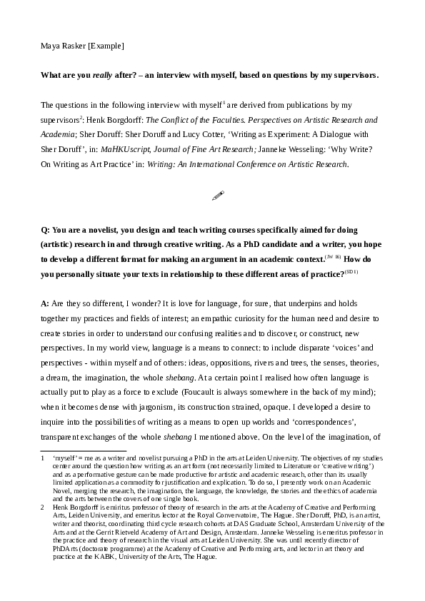In the ‘experimental system’, as mentioned above, one can distinguish between the ‘epistemic thing’, something about which you want to know this or that, and the ‘technical object’, with which we can find out this or that – positions that change in the course of an investigation. (These notions come from philosopher of the history of science, Hans-Jörg Rheinberger). In the production of this particular piece of text, my supervisor’s ideas, the fictive questions, and the apparently spontaneous answers operate, alternately, as ‘thing’ I want to know more about, and as an instrument through which I find answers or new insights. The production of the text was in fact used as a piece of my doctoral research; part of it landed in the dissertation.