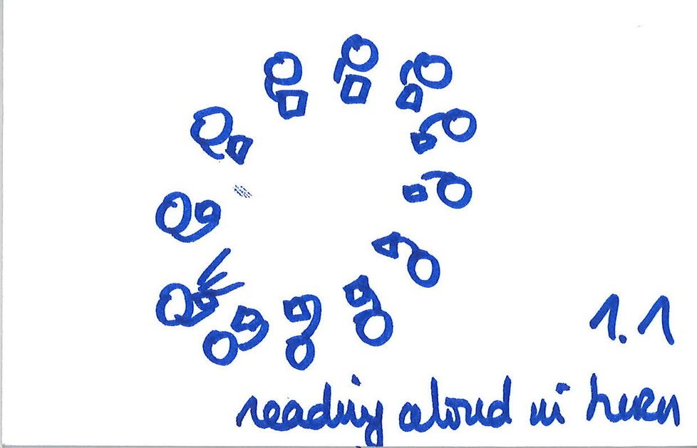 – Step one: In a circle, the participants take turn to read aloud the text they have brought. They can navigate the text freely and read for as long as they feel like while the others listen.