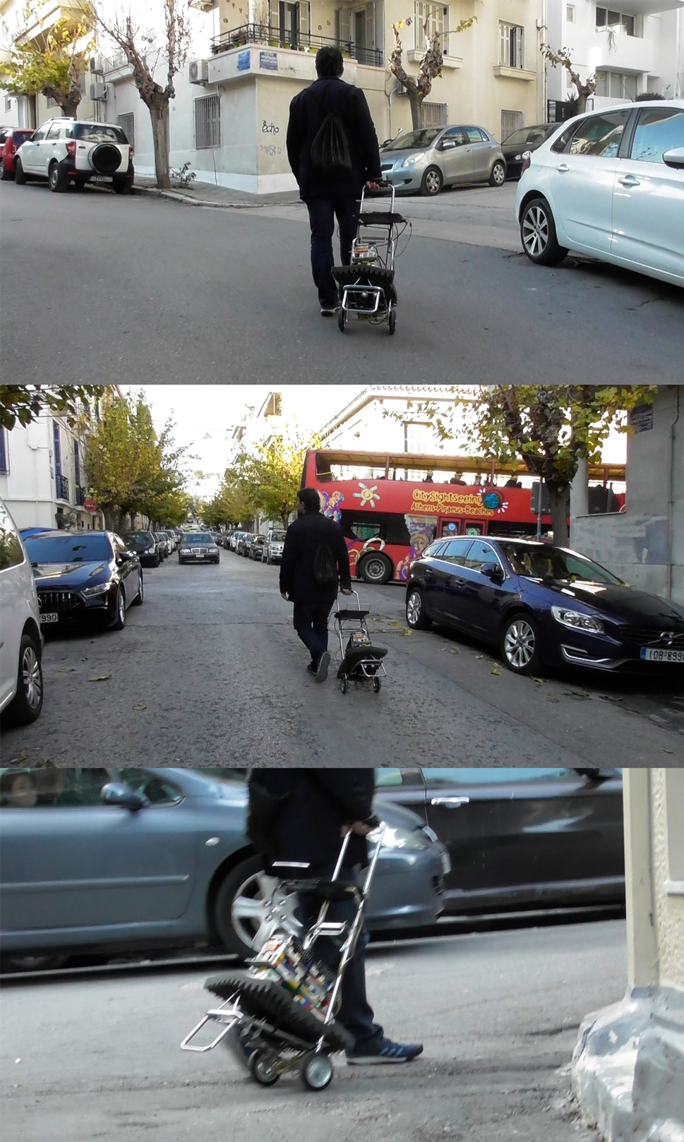 In a series of performances with oral raw material and background noises (words, texts, sound, voices), I explore through the Cipo_ program (Cybernetic Intelligent Parasitic Object), methods between public art and dialogical space in the urban terrain via sound and text where a local public sphere could emerge.In these artworks are raised questions on how the expression of different collective acts (like participation, collaboration, relational approaches) perform relationships. They manifest functional and poetic dimensions with computer and robot technologies (sensors, motors, etc.) (apparatus) on trailers (handcarts trolleys), activating sound responses dialogically, repetitively and differentially in random combinations from word playbacks (archive files, recordings from suppressed political protest demonstration of debt crisis, music notes of barrel organ ‘laterna’, garbage truck noises, soundscape, etc.).