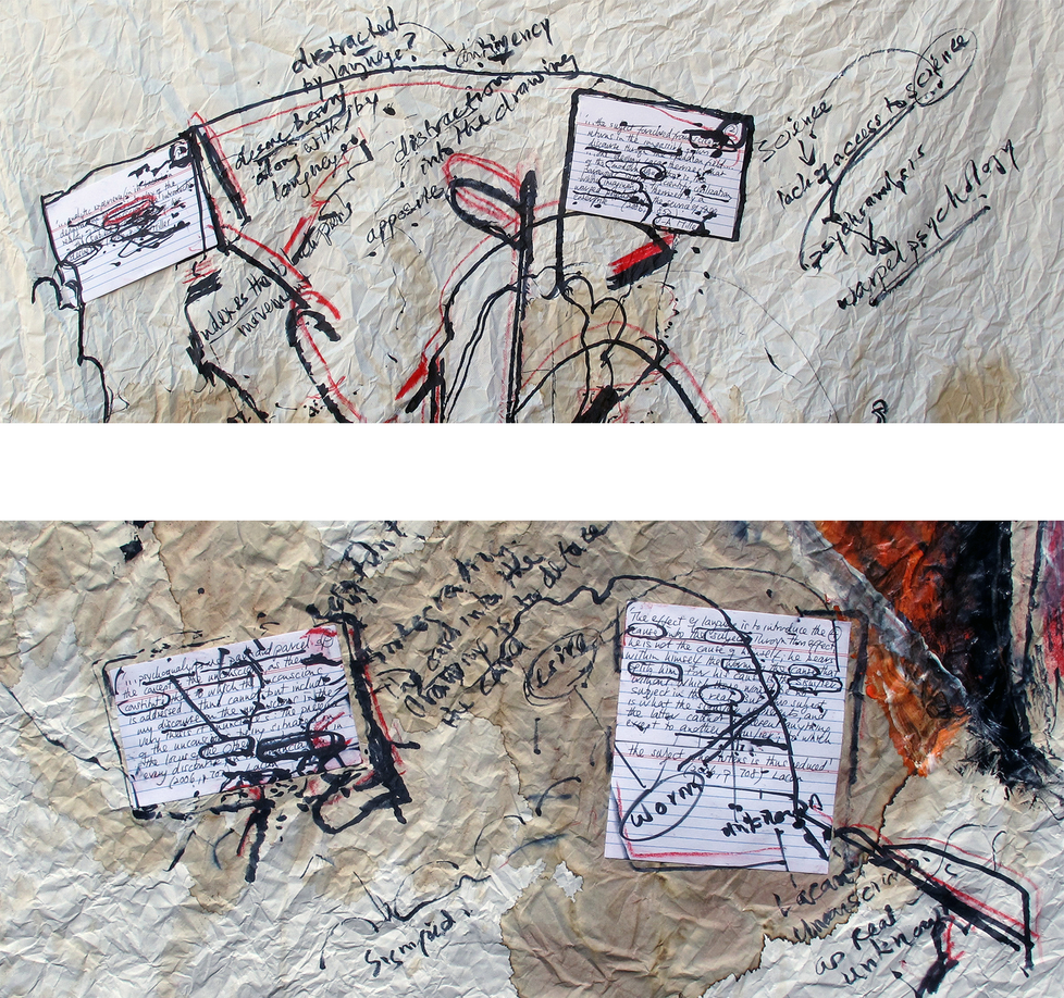 How one speaks and how one writes may be considered different. That said; how one writes is driven considerably by one’s own internal monologue, its idiosyncrasies of speech largely corrected automatically by the conditions of writing. In writing, however, one often strives to communicate, on the assumption that this is possible. Speech that bears its own implicit enunciation is unlikely to make it to the page, as it were, unless – which is a question that greatly interests me – one punctuates it and retains grammar in elements of dysfluency. Typify one’s speech as reflexive, and concerned with reflection on the nature of another activity, such as drawing, where speech and drawing are thereby drawn together. Typify writing as reflective critique of drawing, where one’s theoretical sources are brought into play. This is proposing the orientation of artistic research from the perspective of language, whereas the same ratio may be proposed from the perspective of drawing. Add to this a current interest in the structuring of artistic research itself, debated through language and drawing, where language is both a creative tool in its own right, and a means of developing reflective critical argument. What one can do through language, that is arguably more resourceful in this respect than drawing, is to speak in and through writing in variable voices. Taking the visual-material medium of drawing as the generator of interest in language, the starting basis of inquiry is perception, mainly visual, but also involving other senses.