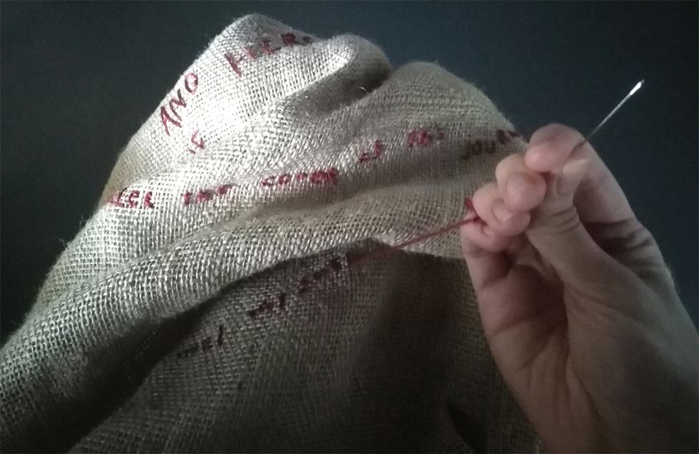 2. Adélia Santos Costa, Redress, Embroidering words in the burlap dress.Detail of performance that took place in Fronteira da Paz Memorial, Vilar Formoso, Portugal 2022