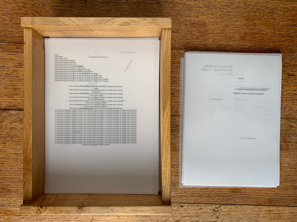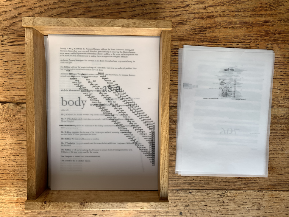 MOTHERBABYHOME (2019) is a 796-page ‘report’ and durational performance. It is a ritual, an excavation of voices composed between 2014 and 2019 entirely from language drawn from historical archives and contemporary sources, including files given to me by local historian Catherine Corless and material sent to my Gmail account via Google Alerts (using ‘tuam’ and ‘mother and baby’).
