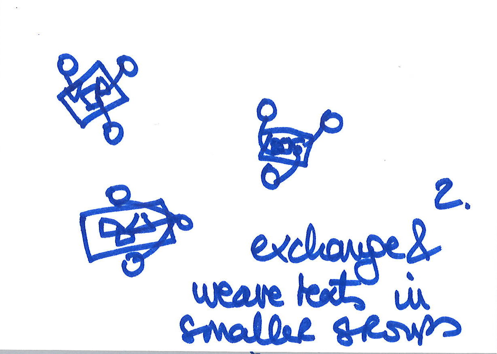 – In groups of 2 or 3, the participants exchange about what they have experienced in (1) and read from the texts they have written during step two. Together they weave a short text as an echo to their exchange.