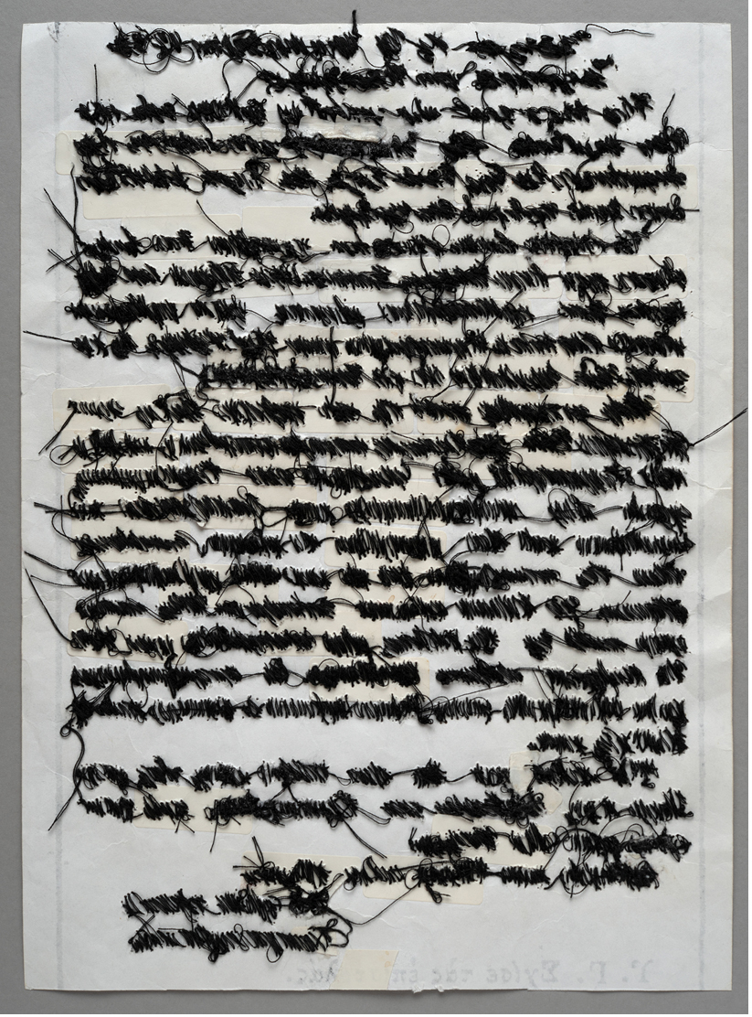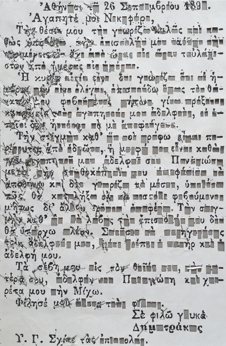 Interventions on letter: Wax impregnations and waxing, seaming, threading through, replacement of letters and words with the use of a cutter (knife) and a stapler, reforming the grammar elements in a cryptic process.