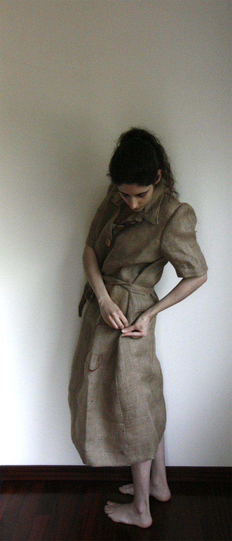 1. Adélia Santos Costa, 2022. Redress. Burlap, cotton yarn, needle. Variable dimensions. Note: Burlap dress to be worn by the artist during performance.