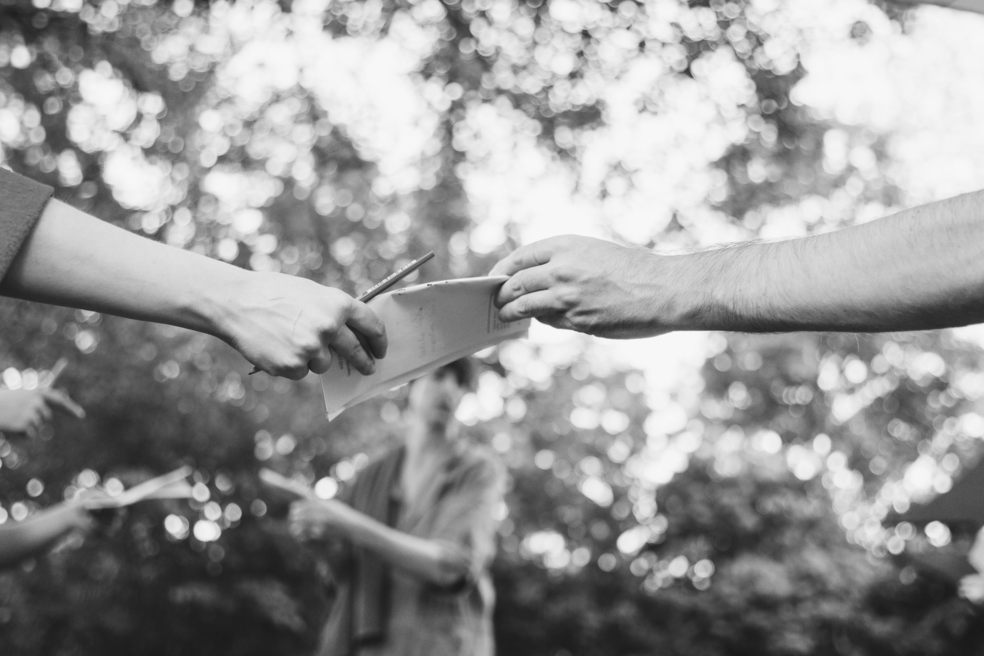 Each participant is invited to bring to the meeting an A4 page displaying a text to be shared. The situation unfolds in two sequences.