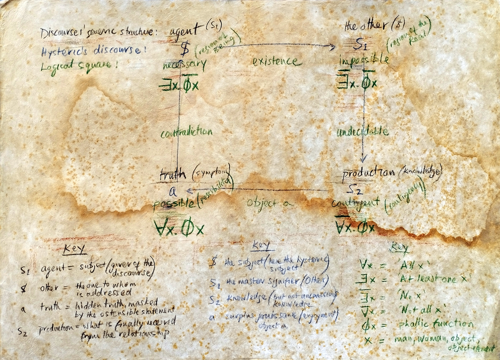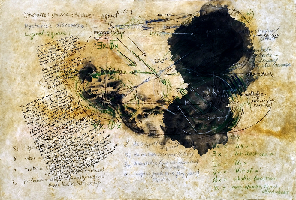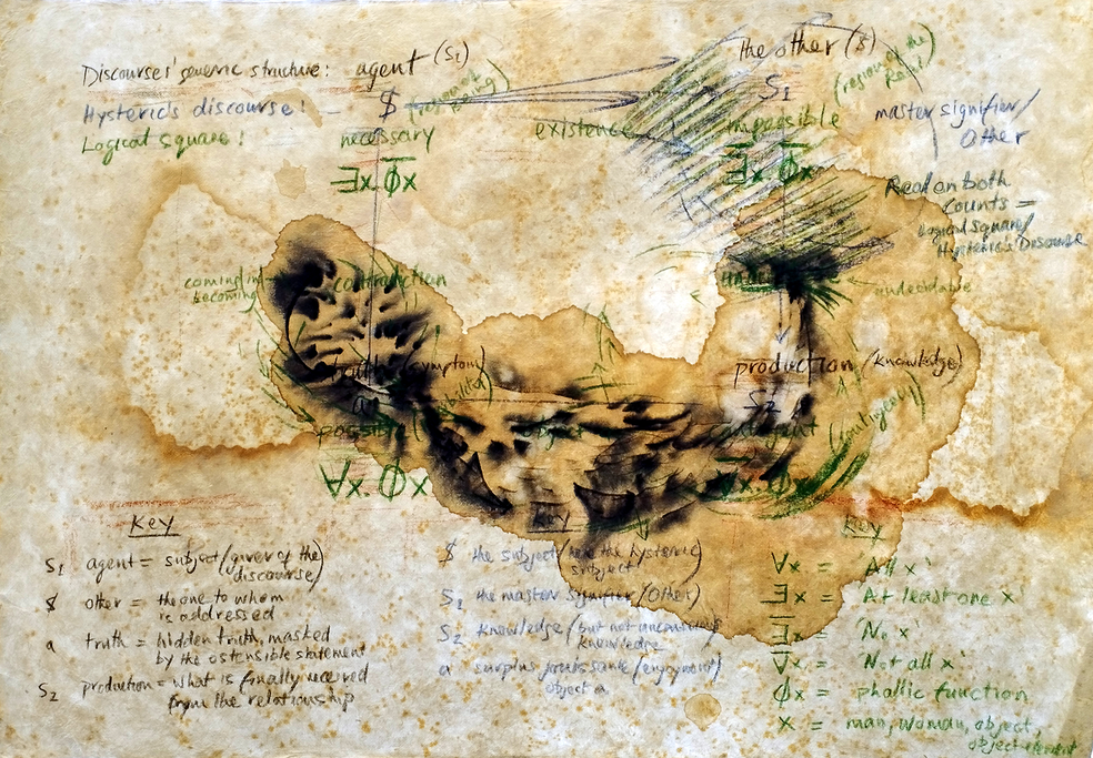 4. Michael Croft, A diagram [from the article, Artistic Research Mapped]. The diagram, fifth state, showing Lacan’s logical square, reworked to re-emphasize mapped aspects of Lacan’s Hysteric’s Discourse, with additional hand-written explanation. Dermatograph pencils, coffee stain, ink stains and crayon on corroded handmade paper, 76 x 52cm, 2023
